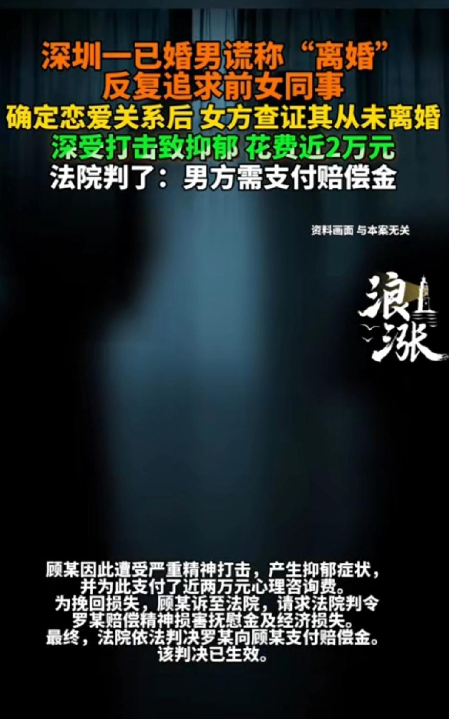 太渣了!深圳,一已婚男人骗前同事说自己离婚了,反复追求对方,两人谈起了恋爱。没成想,女方多次提出想看离婚证,男子都找借口躲闪,后来一查,发现这男的从来没离过婚!女方受到严重打击,得了抑郁症! 2018年,顾某(女)和罗某(男)是同事。罗某多次跟顾某表白,但顾某知道他已经结婚了,所以每次都拒绝了。这说明顾某本来是个很清醒的人,不想插足别人家庭。 到了2023年8月,罗某又来找顾某。这回他换了个说法:我离婚了,现在是单身。他反复追求、各种承诺,说得跟真的一样。顾某信了,就跟他确定了恋爱关系。 恋爱期间,顾某心里还是不踏实,多次让罗某拿出离婚证看看。但罗某每次都找借口拒绝,死活不肯拿出来。 顾某心里觉得不对劲,于是自己跑去查证,结果大吃一惊:罗某从头到尾都没离过婚!他还是有老婆的人。 顾某觉得自己被彻头彻尾地骗了,精神受到严重打击,得了抑郁症状,不得不去心理咨询,前前后后花了近两万块钱。 顾某把罗某告上法院。罗某还狡辩说:“你又没拿出抑郁症的诊断证明,凭什么说是我害的?” 但法院看了微信聊天记录等证据,发现罗某确实亲口说过“我离婚了”,也一直隐瞒真实婚姻状态。 法院认定:罗某有错,他的欺骗行为和顾某的精神伤害之间有直接关系。最后判罗某赔偿顾某的经济损失和精神损害 在我看来罗某的行为,根本不是普通的“渣”,而是一种有预谋的欺骗。他知道顾某在意他有没有结婚,所以专门编了个“我离婚了”的谎。 他利用顾某的信任,骗走了她的感情、时间和健康。顾某因此抑郁,花了两万块看病,这笔账不算在他头上算谁头上? 一个已婚男人,不好好过自己的日子,跑到外面骗单身女性,毁人家心理和名声。他老婆知道了,不也得崩溃? 这种人,赔钱都是轻的。希望这个案子能提醒所有想玩这种把戏的人:别以为骗感情不用付出代价,法院的判决书就是你的“账单”。 诚实,是做人的基本底线,更是谈恋爱的第一原则。你可以不爱,但请你不要骗。愿每一个人都能遇到真诚的人,也愿每一个骗子,都逃不过法律的巴掌。