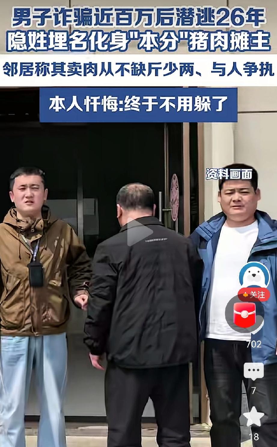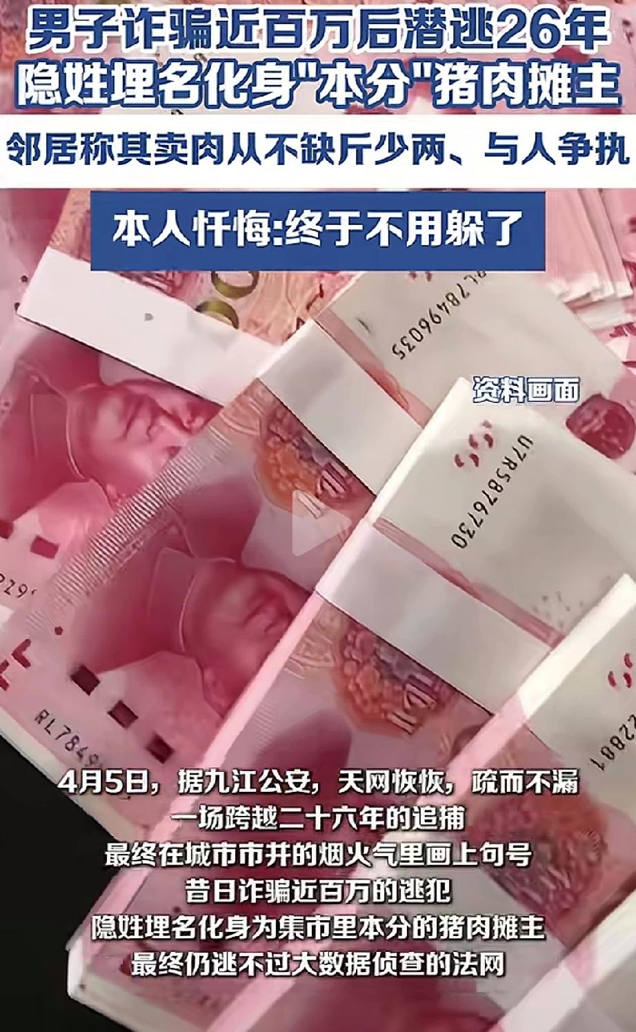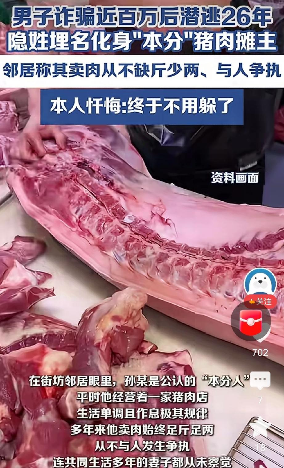 终于不用躲了!辽宁,男子孙某在2000年诈骗93万元衣物后连夜跑路,整整躲了26年,摇身一变成了九江菜市场里人人夸的本分猪肉摊主。警方靠大数据比对,仅用12小时就锁定了他。被抓时,孙某长叹一声:“26年了,终于不用躲了”。 2000年,孙某耍了个坏心眼,虚构自己有厉害的供货渠道,骗走了价值93万元的大批衣物,当晚就带着赃款消失得无影无踪 。那时候的93万可不是小数目,能买好几套房呢! 为了不被抓,他可是费尽心机:用了3个不同的假名字,还办了假电焊证装成技术工人 。 一开始在辽宁当厨师,2006年跟着妻子搬到九江,干脆转行卖猪肉,想彻底洗白自己。 这26年,他演得可真像那么回事!每天凌晨2点就去批发市场进货,白天守着肉摊,晚上准时回家,作息比闹钟还准。 邻居都说他人特好,卖肉从来足斤足两,跟谁都不吵不闹,是个老实人。就连跟他过了20年的老婆,都不知道他的真实身份和过去的罪行。 但狐狸再狡猾也斗不过好猎手。3月31日上午8点,民警在大数据平台发现了他的踪迹,把26年前那张模糊的旧照片和数据库一比对,立马就锁定了目标 。 接着线上追踪他的行踪,线下悄悄走访,当天晚上8点就在他住的小区把他抓了,前后才用了12小时 26年提心吊胆,每天怕敲门声,这日子比坐牢还难受吧?他说‘终于不用躲了’,那是真话。” 可当年被骗走93万衣物的人呢?26年,那笔钱可能让一个家庭倾家荡产,让生意人一夜破产。受害者等这一天等了26年,头发都等白了!” 最吓人的是什么?是他伪装得太好了。凌晨进货、足斤足两、从不吵架……连老婆都没发现。你说这样的人,到底是真变老实了,还是太会演了?” 正义可能会迟到,但永远不会缺席。如果你做了错事,最好的选择不是逃跑,而是勇敢面对,主动承担责任,这样才能真正解脱,重新做人 。 法网恢恢,疏而不漏。不是不报,时候未到。时候一到,一切都报。 希望所有还在逃亡路上的人,都能听懂这句话。早点回头,比什么都强。