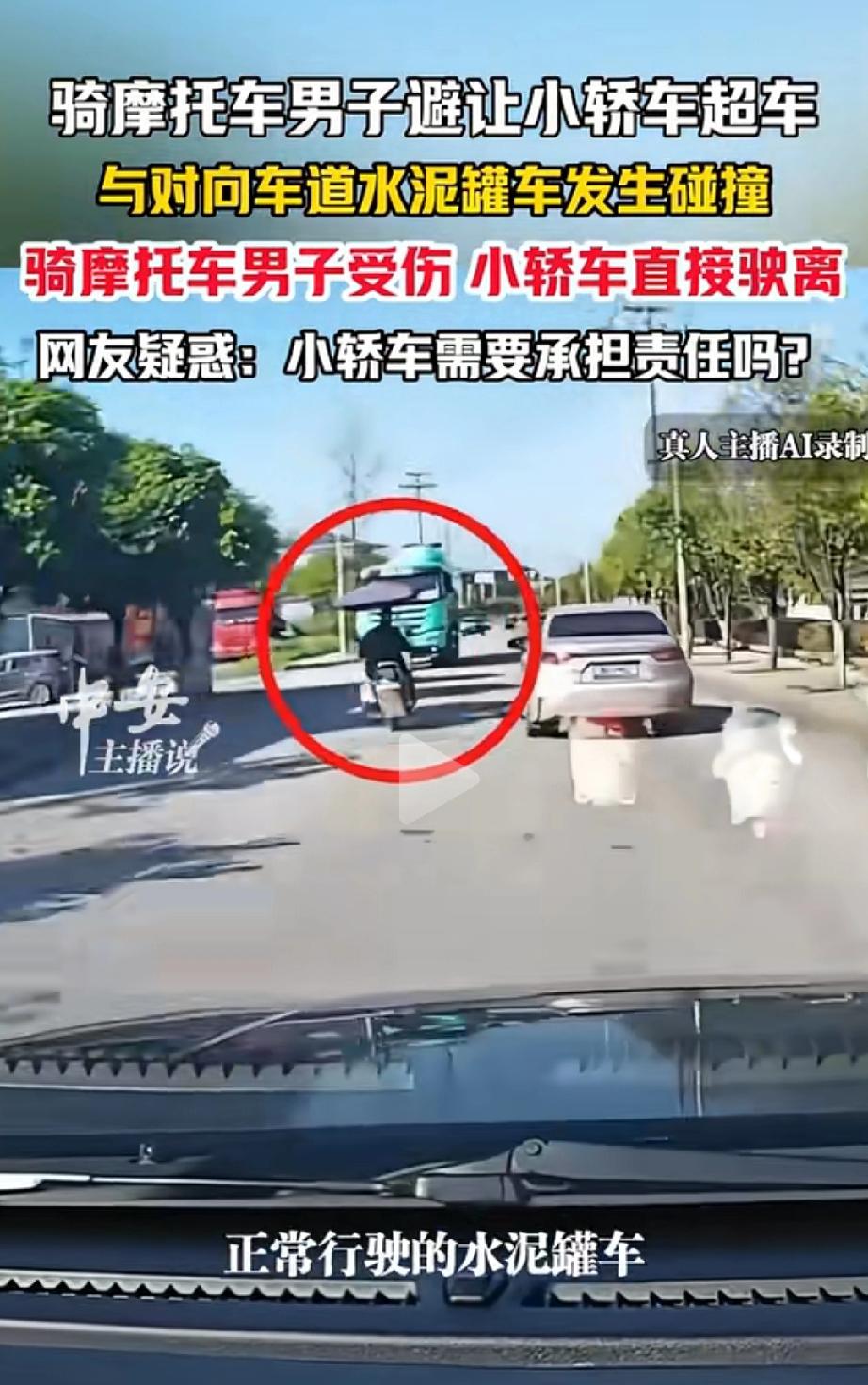 吵翻了!湖南郴州,一名骑摩托车的男子,为避让后方想超车的小轿车,慌忙避让时失控冲入对向车道,撞上正常行驶的水泥罐车,男子当场受伤。没成想。而引发事故的小轿车,却直接开车溜走了。网友热议:没和摩托车直接碰撞,这辆小轿车到底要不要担责? 当时,摩托车男子正正常骑行,突然发现身后有一辆小轿车,明显有超车的意图,而且靠得很近。男子担心被撞到,赶紧往左侧车道靠拢避让。 可这一避让,方向没控制住,摩托车直接失控冲进了对面的车道。不巧的是,对向正好有一辆水泥罐车正常行驶,根本来不及反应,摩托车狠狠撞了上去。男子因此受伤,摩托车也受损严重。 而最让人气愤的是,那辆引发这一切的小轿车,自始至终没和摩托车发生直接碰撞,看到事故发生后,没有停车查看,也没有帮忙,反而直接加速驶离了现场,留下受伤的男子和混乱的现场。 网友们核心争议就是:没直接碰撞,小轿车该不该负责? 有网友气愤地说:“肯定要负责!要不是他强行超车,人家好好骑车怎么会失控?这就是间接肇事,还逃逸,太缺德了!” 也有网友举例反驳:“之前江西半挂车超车撞摩托、甘肃半挂车别车致摩托侧翻,交警都判了全责,没直接碰撞也得担责,这小车跑不掉!” 还有网友心疼摩托司机:“太无辜了!好好骑车遭了无妄之灾,小车司机太自私,只顾自己赶路,不管别人死活,逃逸更是错上加错!” 道路不是你家的,超车不能不管不顾。小轿车虽没直接撞人,但它的超车行为是事故的直接诱因,出了事就想溜,这种逃避责任的行为,实在让人不齿。 法律讲的是因果,不是只看有没有碰到,这种侥幸心理,根本行不通! 超车前要观察路况,不能强行、近距离超车,更不能因为自己的操作,把别人逼入危险境地。 出了事故别想着逃逸,不管有没有直接碰撞,只要你的行为引发了事故,就该承担相应责任,逃得了一时,逃不过法律的追责。 平安出行无小事,每一次任性驾驶,都可能酿成无法挽回的悲剧。希望所有司机都能牢记:稳字当头,互相礼让,别让一时的自私,毁掉自己和他人的人生。