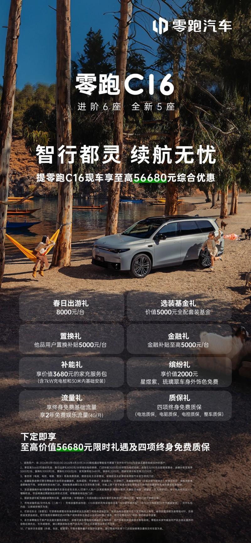 C16-20 万内真六座 SUV 怎么选?零跑 C16 对比奕派 008,家用刚需看过来 对于上有老、下有小的家庭,或是有轻度商务需求的用户,六座SUV是兼顾舒适与实用的最优解。20万预算内,零跑C16与东风奕派008是热门之选,同为六座新能源SUV,核心差异集中在空间、续航和性价比上,精准对比后,家用选择更清晰。 空间上,两者定位不同: 奕派008尺寸更大,5002×1972×1732mm,2+2+2布局下,二排独立座椅带零重力模式,180mm通道方便进出,第三排可轻松容纳175cm成年人,更适合那些对空间有绝对刚需的用户。 零跑C16尺寸稍小,4915×1905×1770mm,二排支持座椅通风加热,190mm通道更便捷,第三排空间优化后短途舒适,日常使用也很充足了。 续航补能,零跑更胜一筹: 奕派008增程版纯电202km、综合续航1220km,30%-80%快充仅需15分钟,纯电最高版本续航620km,补能需要28分钟。 零跑C16增程版纯电280km、综合续航1150km,30%-80%快充仅需19分钟,纯电最高630km,补能仅需18分钟。 总的来说,C16的续航和补能体验会更好一点,而且增程版的纯电续航更高,日常用纯电续航更省钱省事,同时C16拥有激光雷达版本可选,智能化更突出。 价格与权益差距明显:零跑C16起售15.18万,同时零跑3月交付破5万,所以本月也开始下放更多购车权益,例如4月的“智行都灵”活动至高享56680元综合权益,购车门槛更低,性价比突出。 奕派008起售18.86万,终端有配置赠送,豪华配置也全面,适合追求大空间和舒适性的用户。 怎么选更合适? 选零跑 C16:预算有限、想要高性价比 + 强智能 + 快充,第三排使用频率不高,日常家用、偶尔长途足够用。 选奕派 008:看重超大空间 + 三排全舒适 + 长途省油,经常全家出行、对乘坐体验要求高,预算稍充足更推荐。 建议假期或是周末带家人到店试驾,亲自坐进第三排、体验二排舒适性,哪台更贴合家用需求,一试便知。