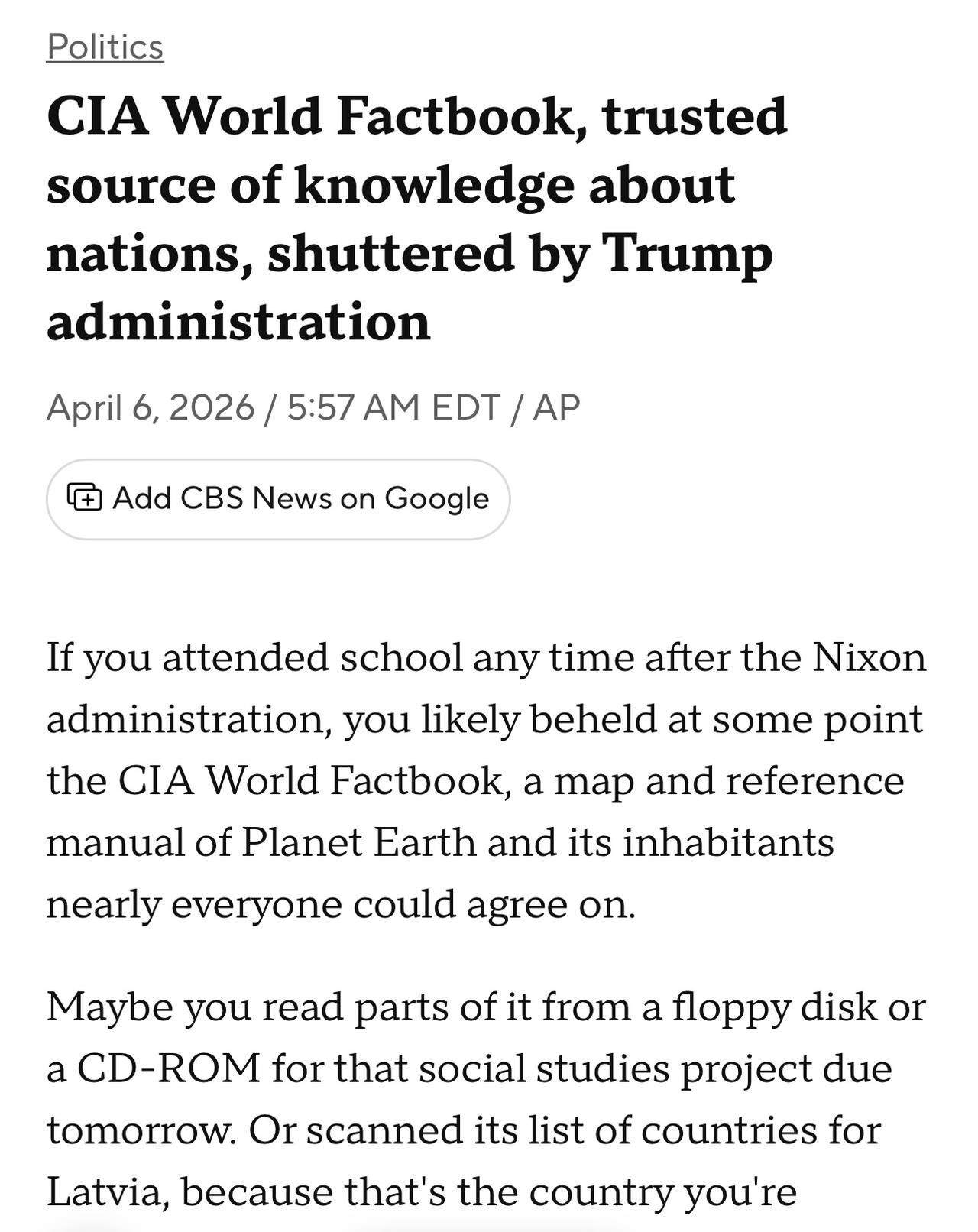 特朗普政府关闭了中央情报局CIA《世界概况》网站,许多人对这个免费、可信的信息来源的消亡感到惋惜,因为很多人过去常常用它来核实有关国家的基本事实。 CIA 世界概况是一个免费的公共网站(自 1975 年以来由 CIA 运营),其中包含有关每个国家的客观事实:地图、经济、政府、军队等等。 2026年2月4日,特朗普政府以中央情报局“任务调整”为由关闭了该网站。他们的告别帖以“保持好奇心”结尾——基本上就是让大家去别处寻找信息。
