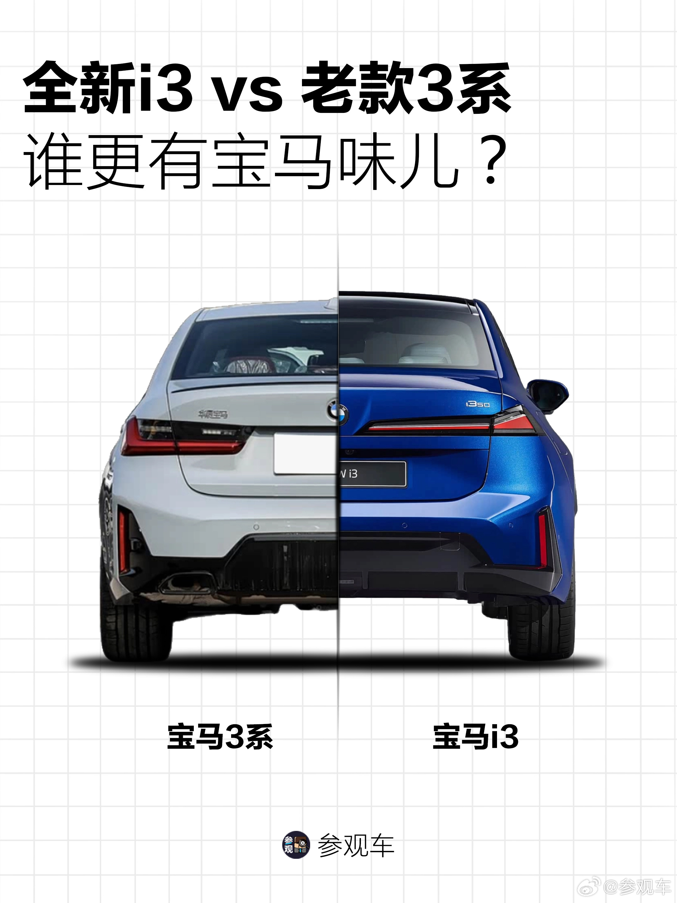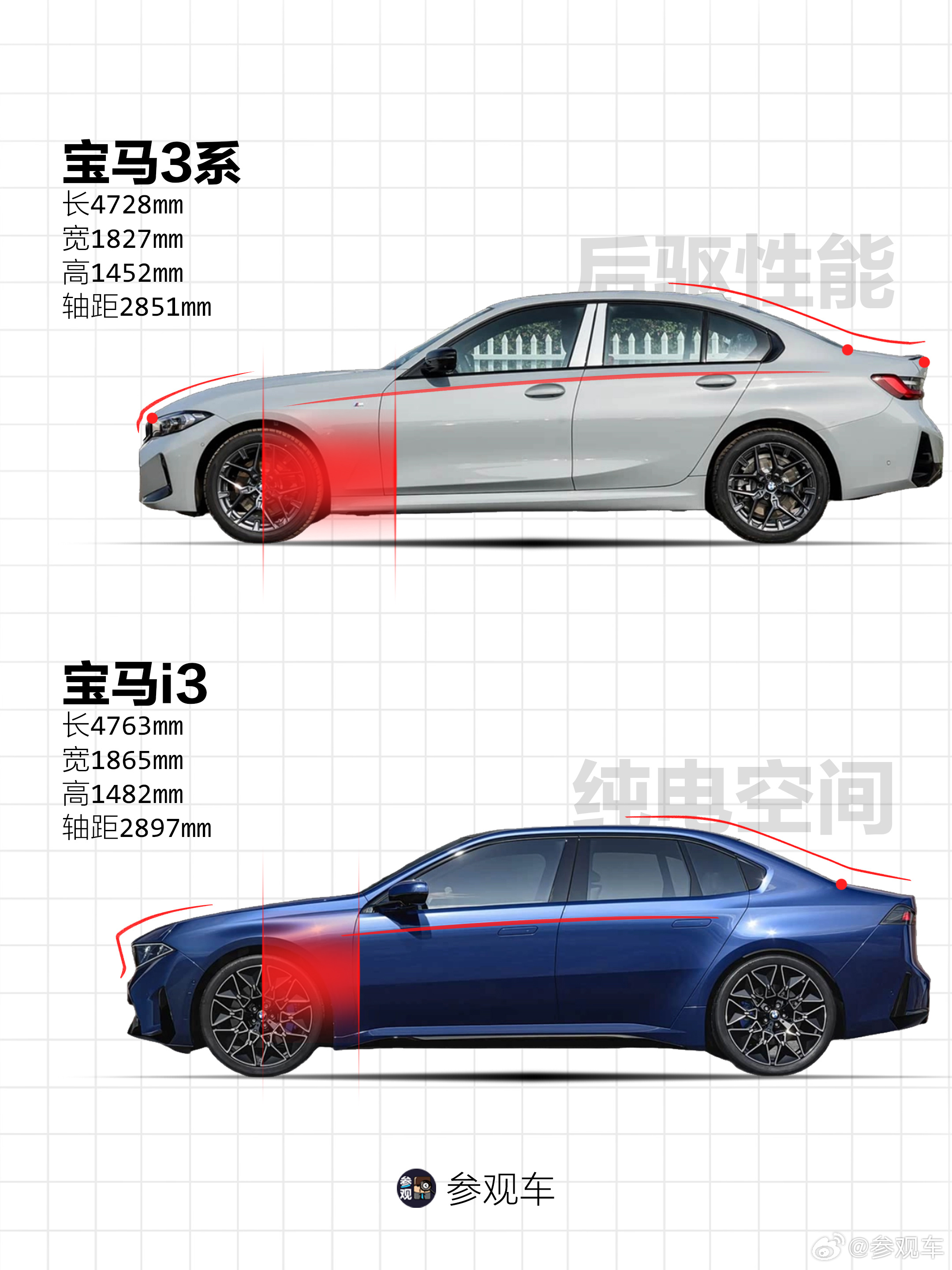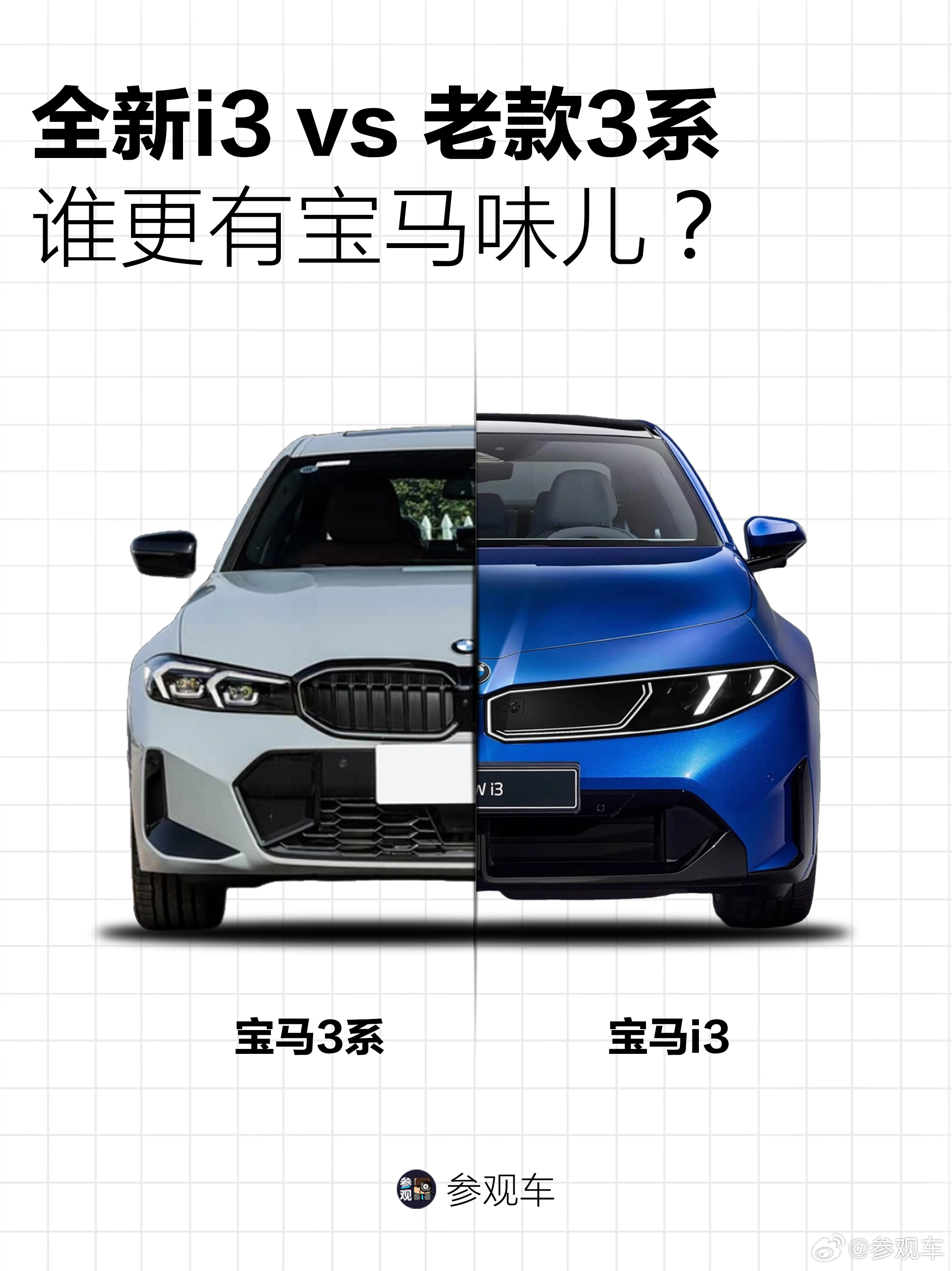 再看纯电i3:· 为了塞下更大的电池、兼顾后排地台高度和头部空间,车身变厚,轴距拉长,车头变短,前悬也不再短小精悍· 为了迁就灯与格栅融为一体的创新结构,车头纵向更高,也让整车姿态变得更稳重,少了过去俯冲的感觉· 引擎盖两侧与前脸黑区结构衔接为整体体量,没有了经典油车格栅前冲的趋势