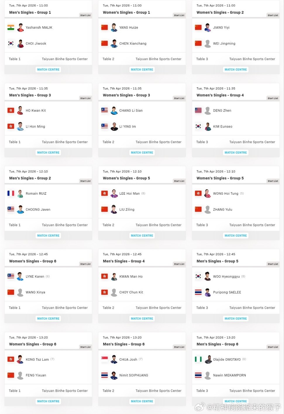 2026WTT太原常规挑战赛第一比赛日赛程:4月7日 单打小组赛11:00 女单