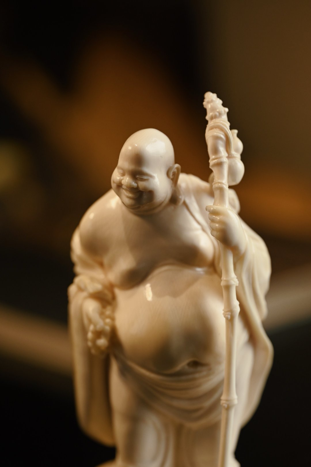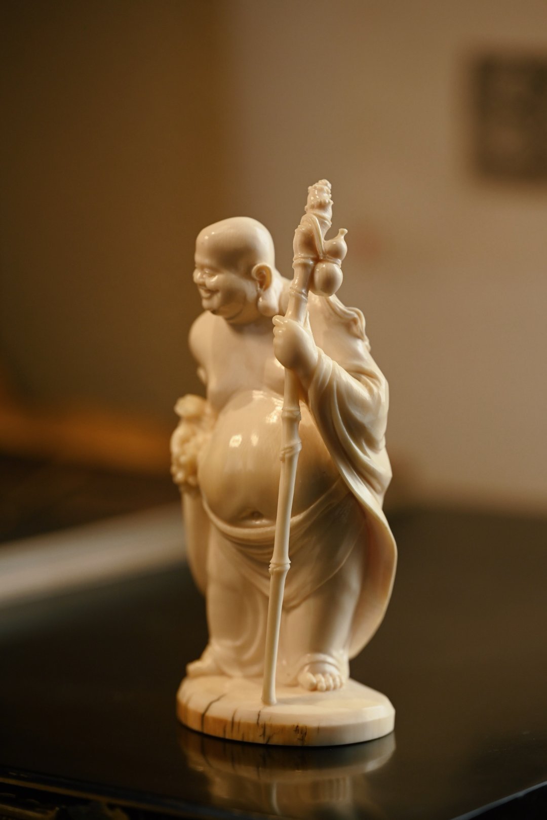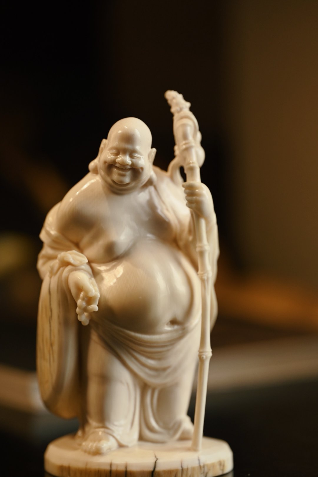 取上乘料子雕琢,工艺精湛,弥勒坦胸露腹,大肚翩翩,笑容憨态可掬,手持禅杖与念珠,衣褶流转自然,神态生动传神,尽显慈悲喜乐之相。