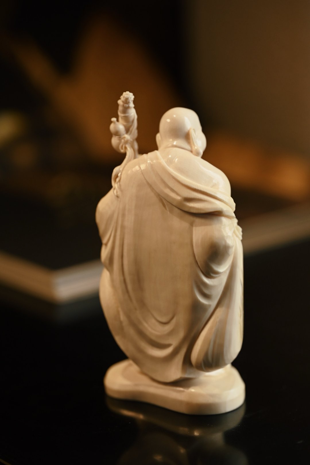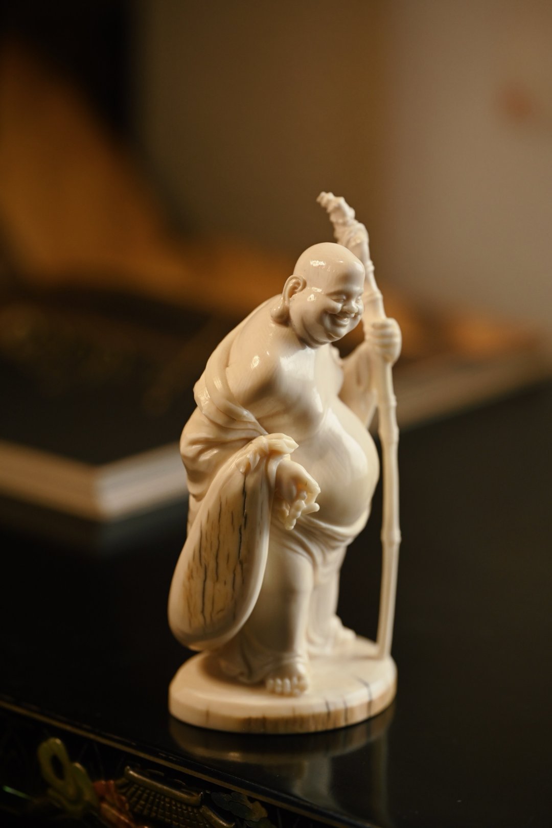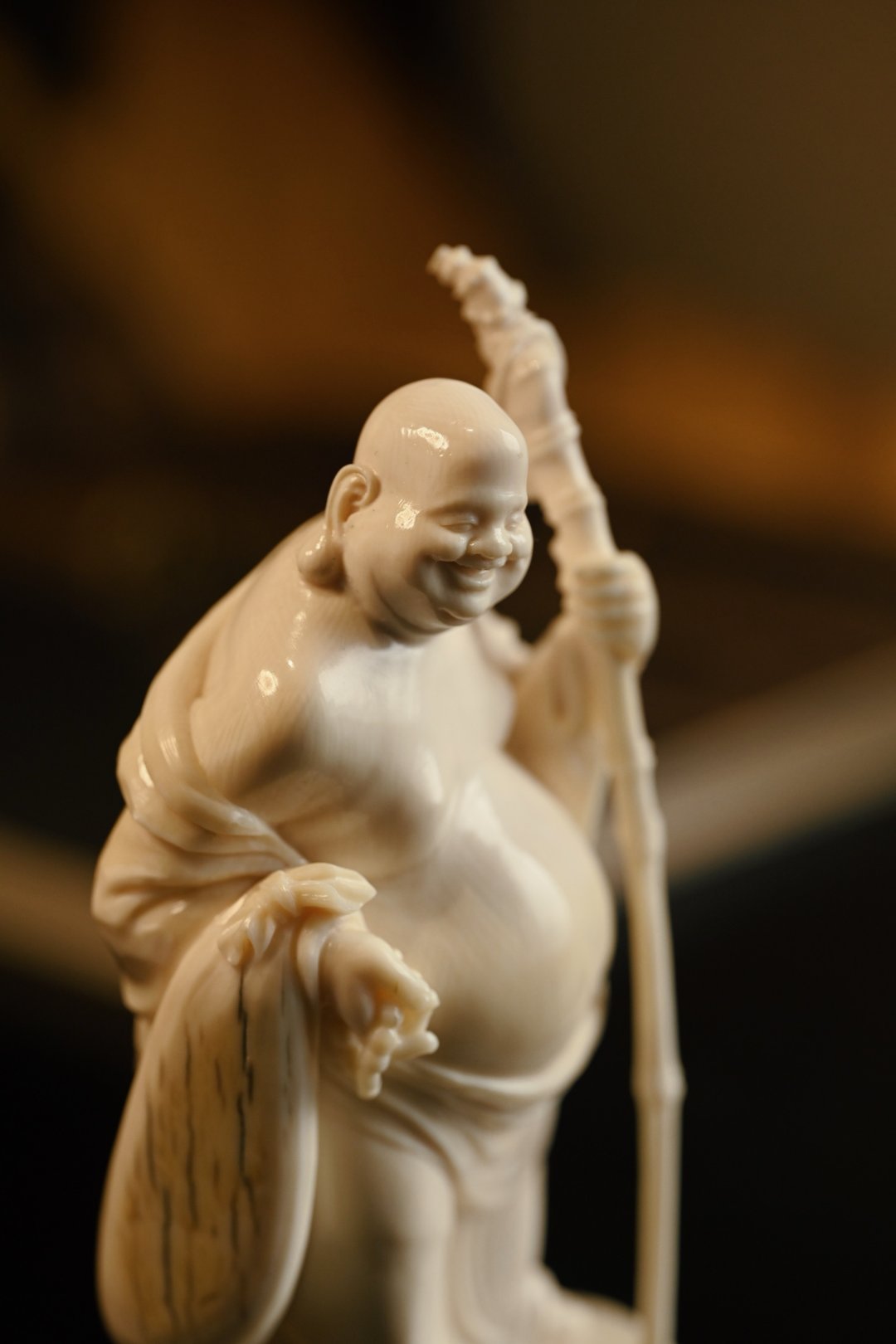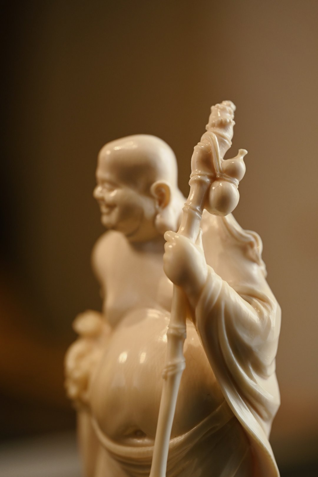 取上乘料子雕琢,工艺精湛,弥勒坦胸露腹,大肚翩翩,笑容憨态可掬,手持禅杖与念珠,衣褶流转自然,神态生动传神,尽显慈悲喜乐之相。