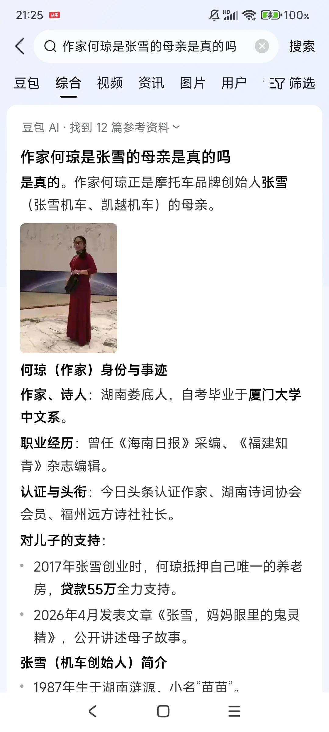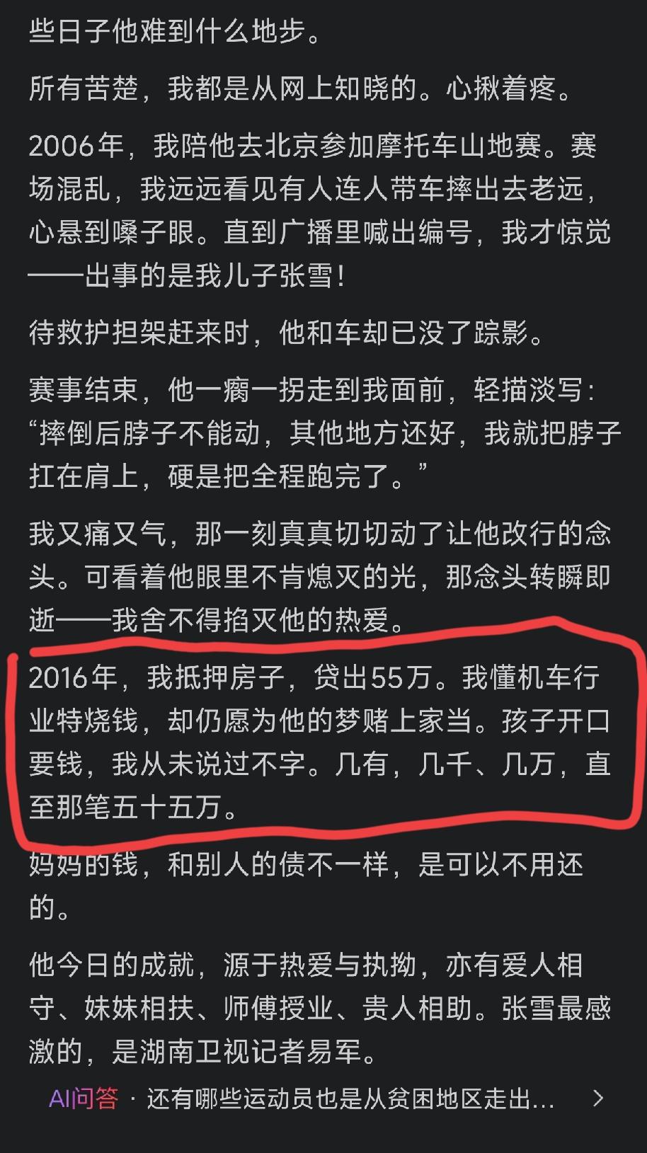 张雪的妈妈是毕业于厦门大学的大学生作家何琼?而张雪本人连初中都差点没读完?妈妈是大学生还是作家,儿子是初中生,这母子之间的差距也太大了吧?我看了很多有关张雪的报道,从来没见他提过自己的母亲,只说母亲跟父亲分开后改嫁去了南方。张雪小时候很苦,住着破破烂烂漏雨的房子,跟奶奶、妹妹相依为命,然后14岁开始辍学修车。张雪的大伯母在张雪机车夺冠后接受采访,讲述张雪由奶奶带大,与奶奶感情最深,从来也没有任何人提到过他的妈妈。现在何琼女士突然发了一篇文章,说到她是张雪的母亲。所以我相信不光是我惊讶,别人也会很惊讶,但是我相信这应该是真的。 何琼女士在写张雪的文章里让我看到了作为母亲的真情流露,她的文字像涓涓细流,温暖有力,文笔很不错。看来张雪的优秀是有基因传承的。 至于张雪有如此优秀的妈妈,为什么小时候还住破房子呢? 我觉得原因是,张雪的父母分道扬镳本身就是因为感情不和,房子是张雪的父亲的,修房子的事情自然是要张雪的父亲来做。 那张雪为什么自始至终不提自己的妈妈呢? 我觉得原因也很简单,自己的妈妈改嫁了,有自己的新生活了,没必要去打扰。 而做母亲的哪有不疼自己的孩子的?何琼女士没在身边照顾张雪张亚兄妹俩,自然很愧疚,但是有时候也是迫不得已,她也要为生活打拼。她在兄妹俩的生活抚养费上,并没有落下。 张雪骑摩托车从小到大出的事情,母亲都出钱给帮助过。 文章里提到张雪年轻时骑摩托车碰到了人,是母亲何琼女士拿了3万,才息事宁人。 张雪后来创业,何琼女士还卖掉房子凑了55万给儿子,到现在也没让儿子还。 所以说张雪之所以展现出一个有血有肉,激情澎湃的人,背后不是无源之水,无本之木。他的母亲一直在默默托举。 母爱是藏在细节里的暖。