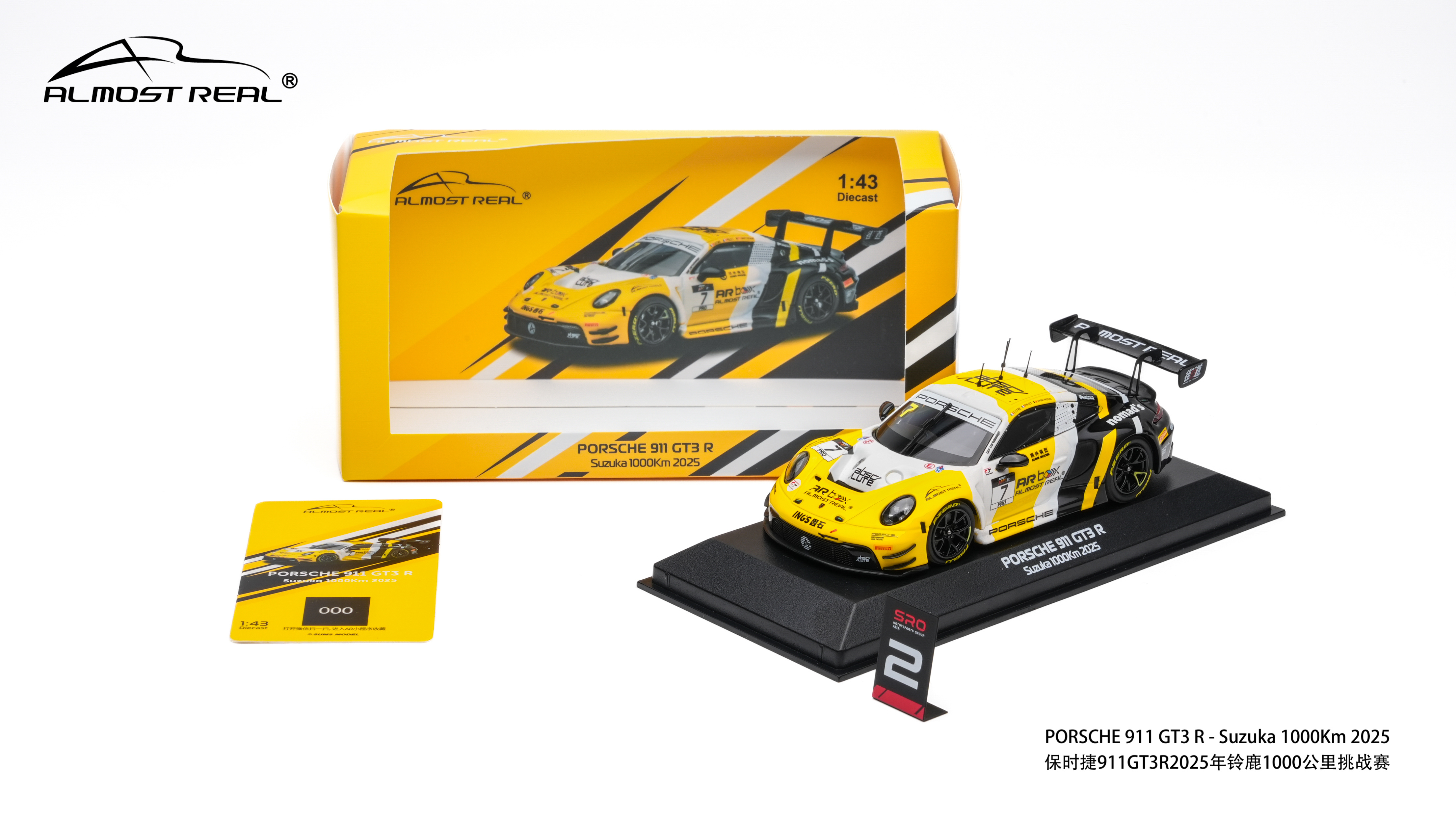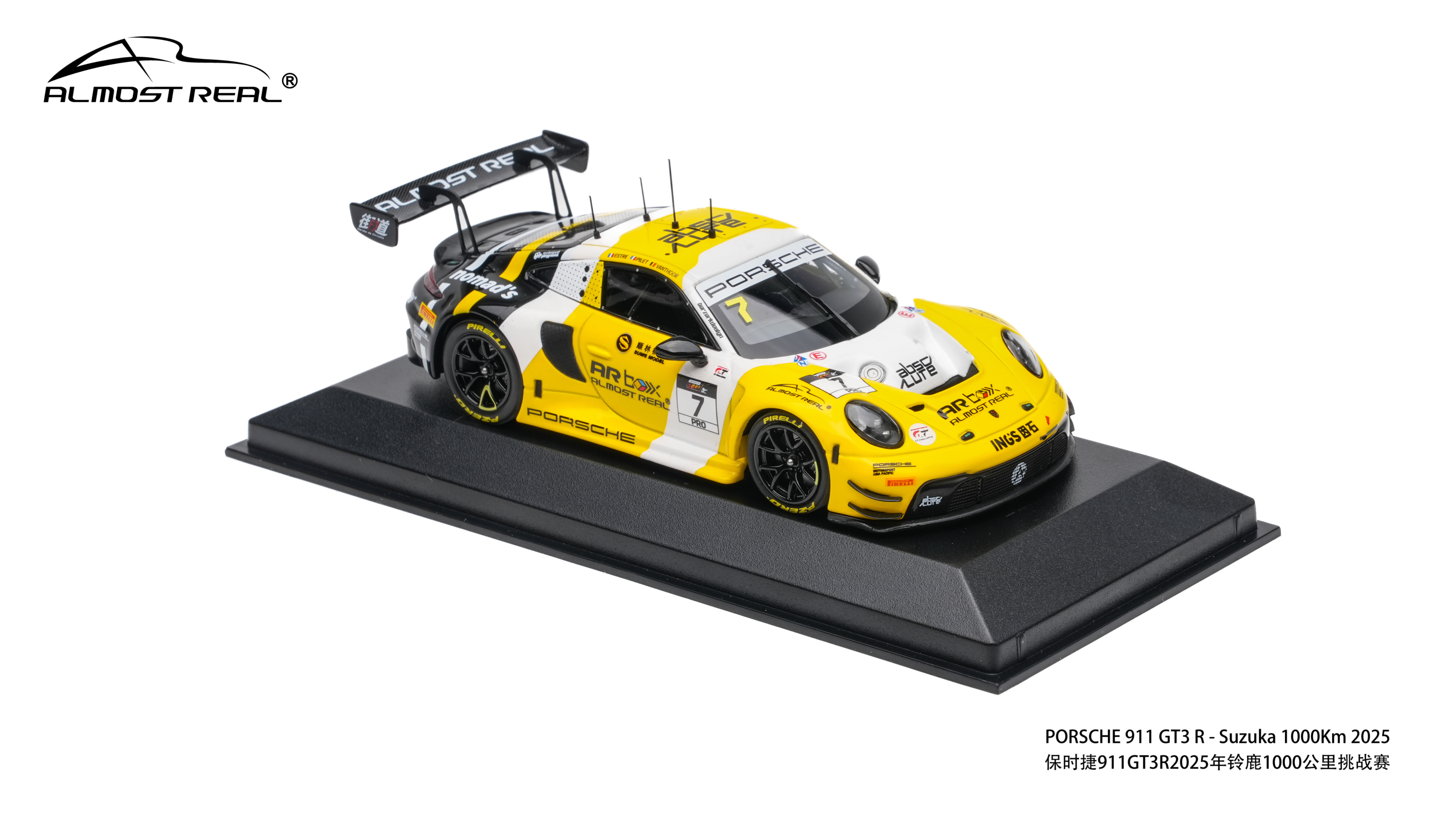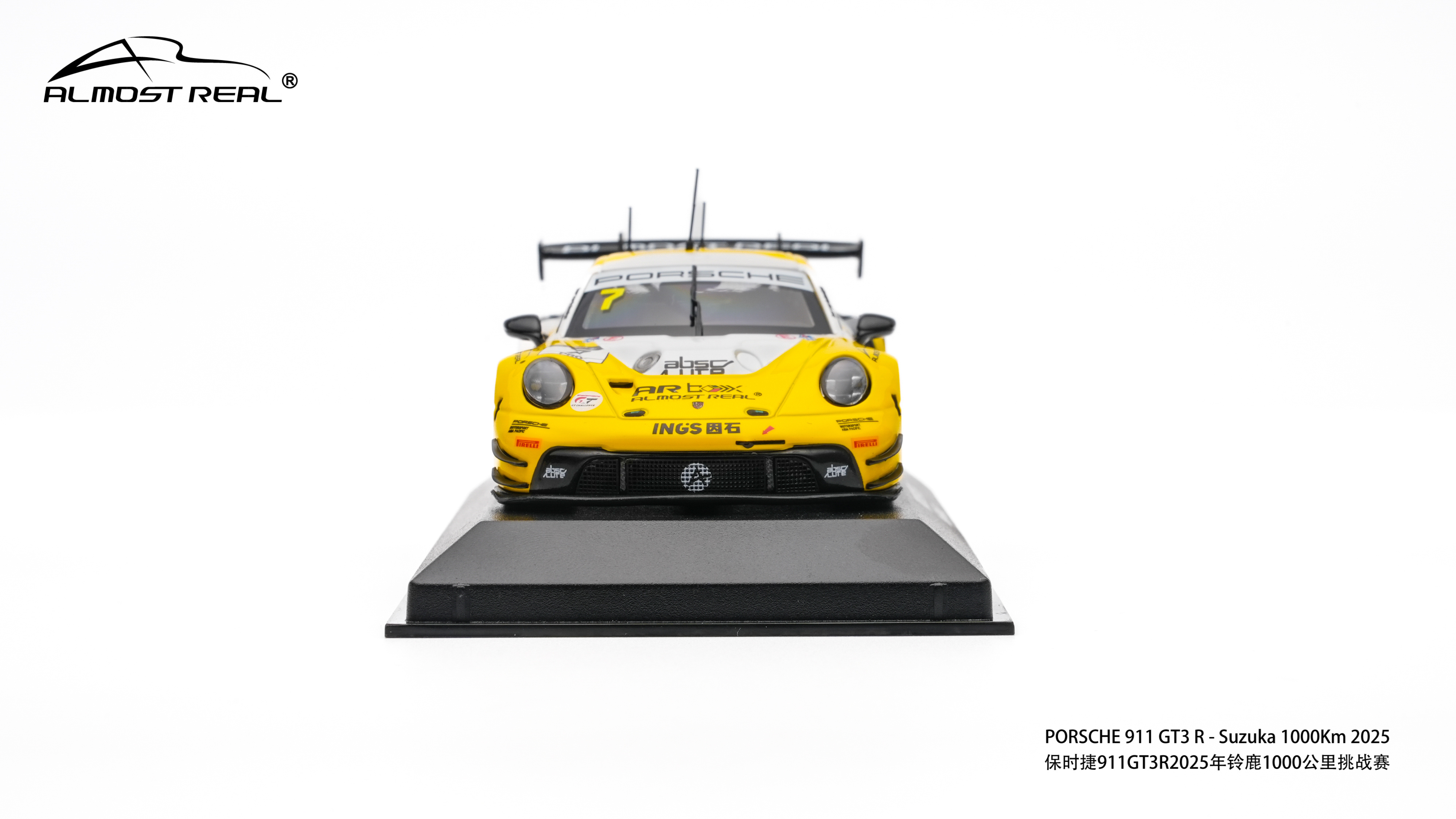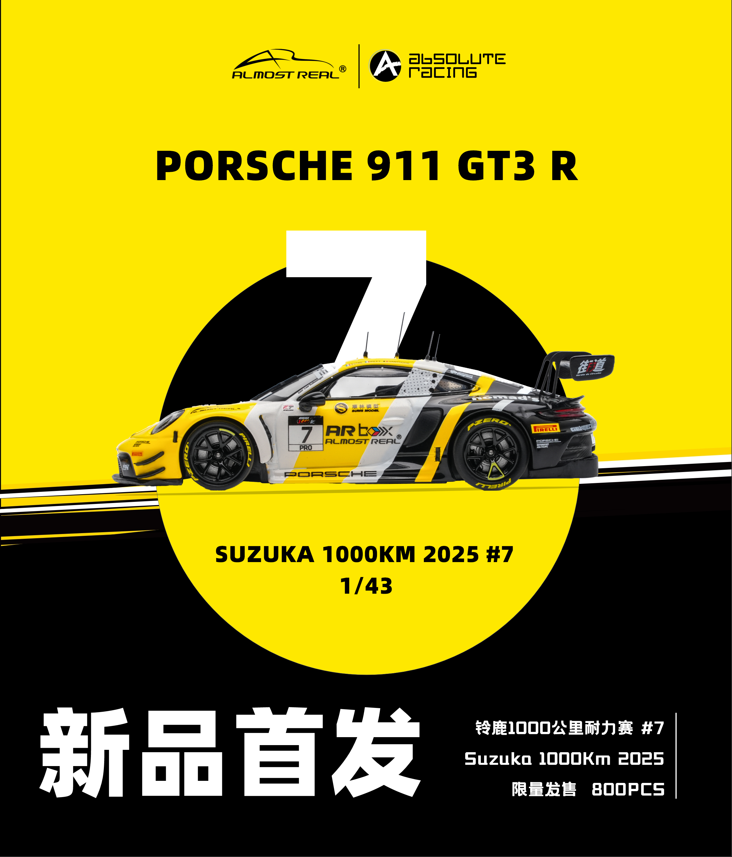 Almost Real 1/43 保时捷 911 GT3 R 2025铃鹿1000公里耐力赛亚军版。本次模型精准还原了2025年铃鹿1000公里耐力赛斩获亚军的7号赛车。这套经典的黑黄配色方案,正是对1984年勒芒冠军JOEST车队保时捷956 NEWMAN传奇涂装的致敬。跨越时空,赛道基因一脉相承。得益于1/43的更大尺寸给我们提供更大的发挥空间,这款车相较于1/64的增加了更多细节:金属蚀刻片:车头进气口升级为金属蚀刻片,视觉更通透锐利。精细独立件:车顶增加天线,雨刮、前盖加油口和车尾拖车绳均采用独立零件,还原真实结构。独家附赠配件:和1/64相同,随车附赠专属的亚军成绩牌,极具展示与纪念意义。发售数量:全球限量 800 台。售价:580元。发售时间:4月8日Almost Real官方旗舰店全网上架,AR 北京旗舰店及AR东莞旗舰店同步线下开售。赛车汽车文化almostreal