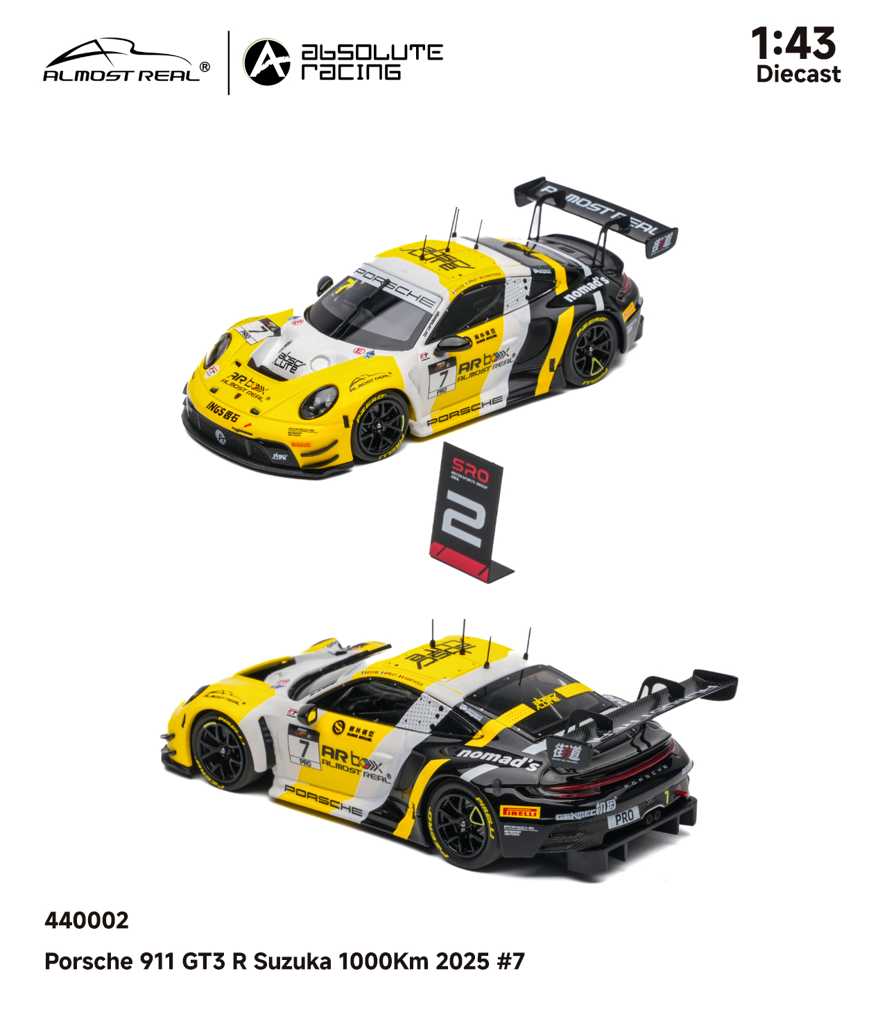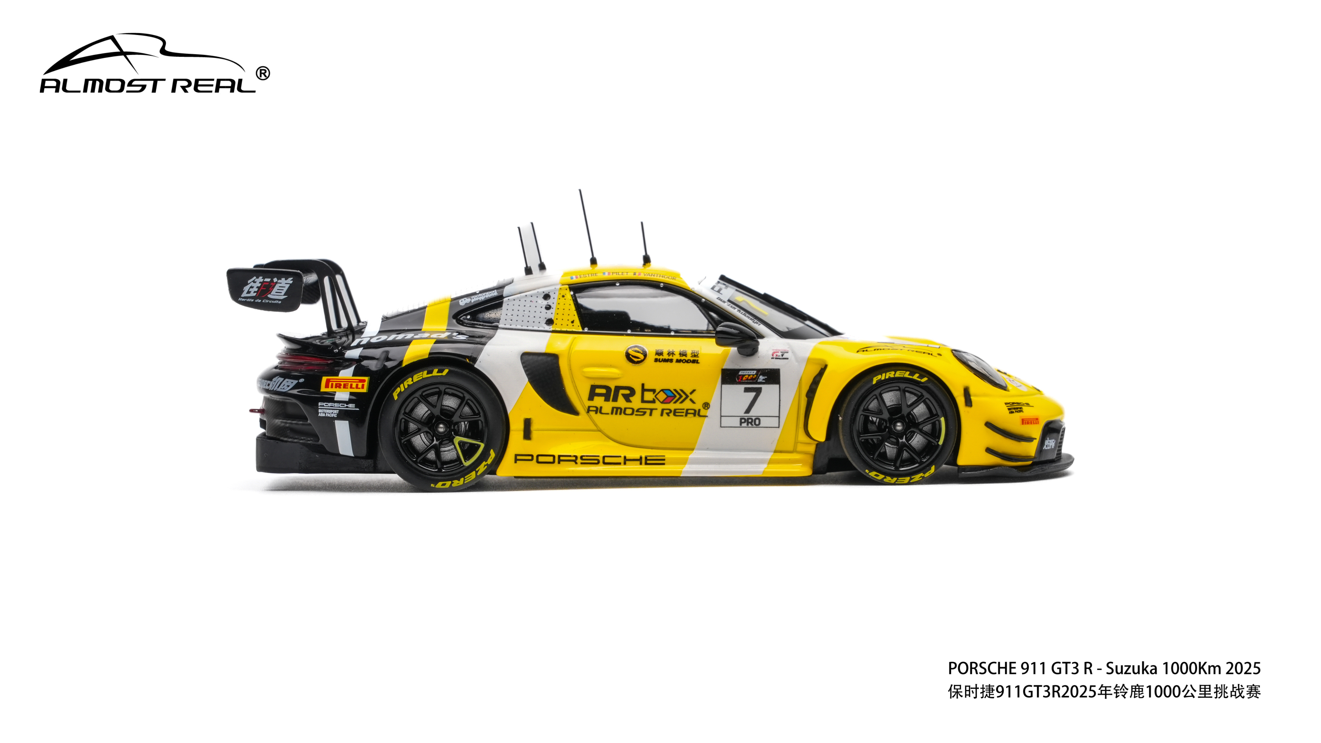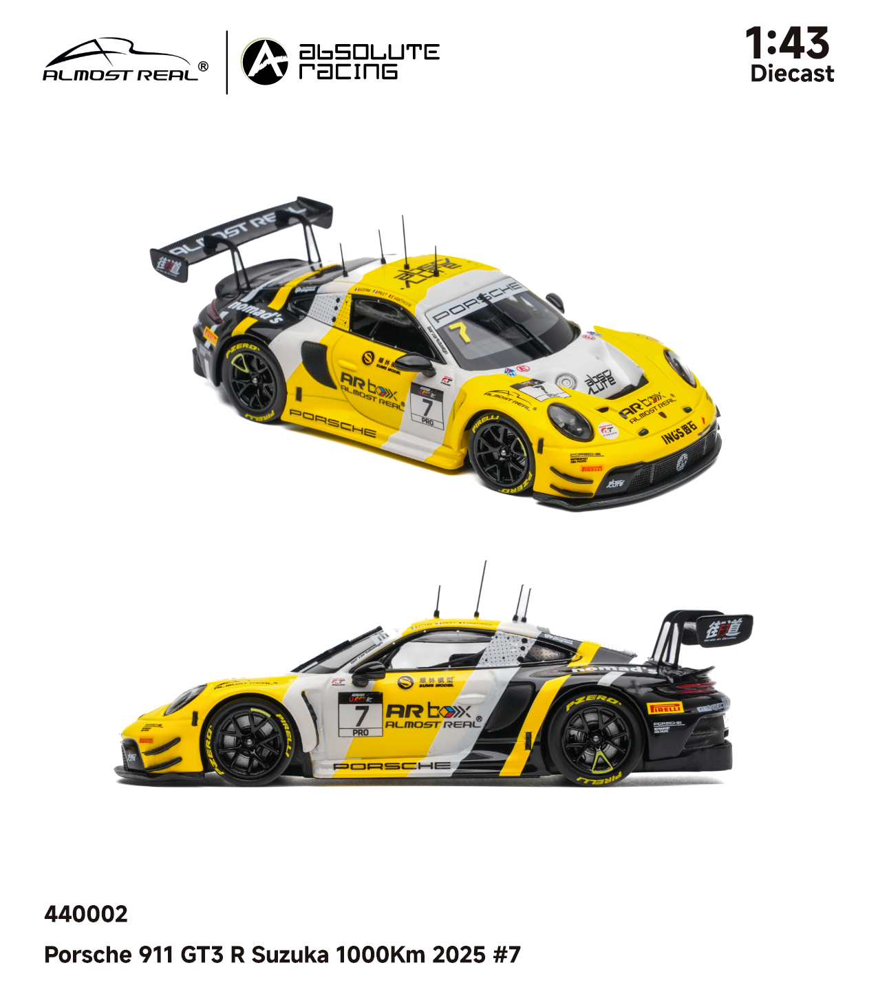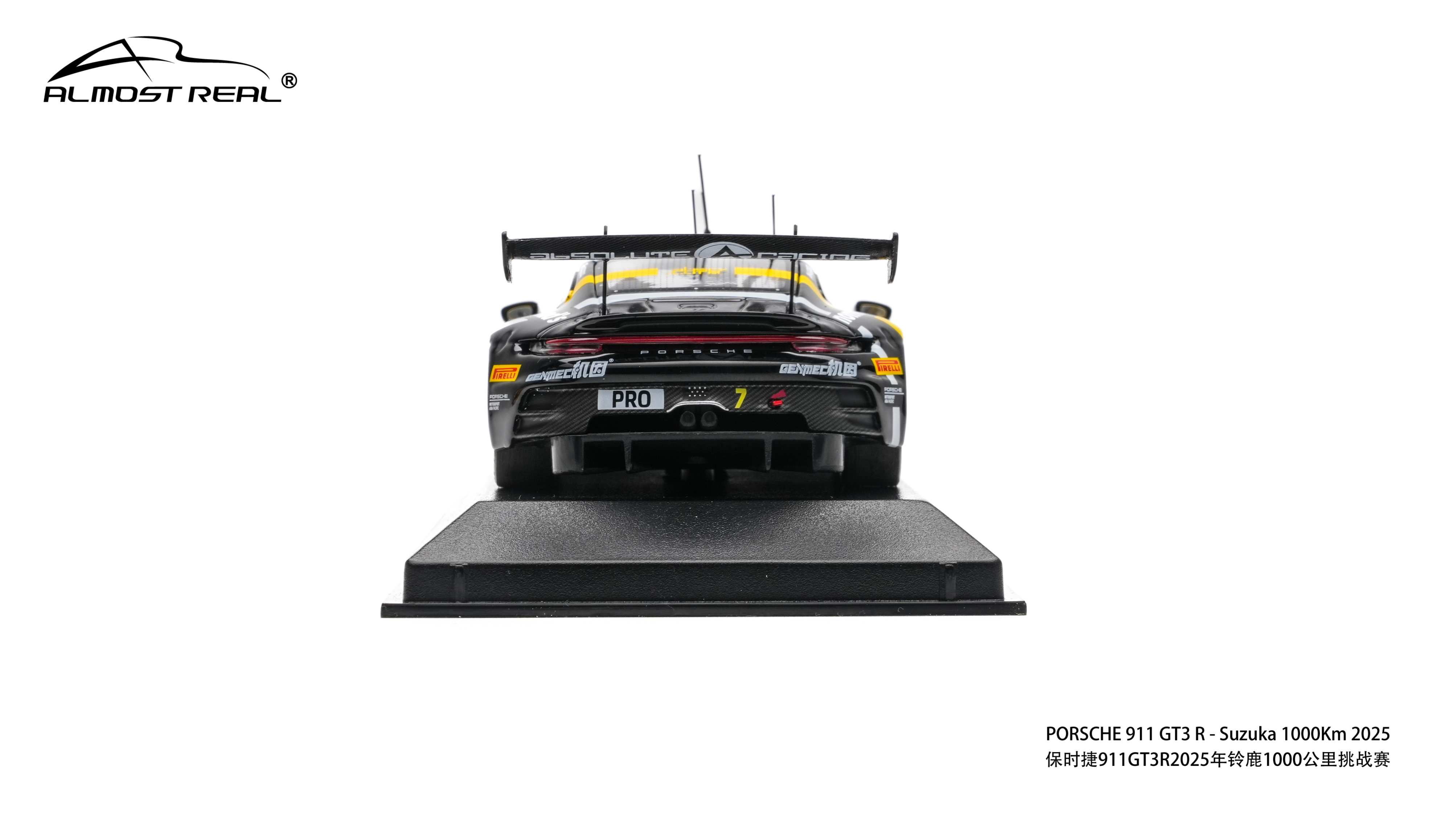 Almost Real 1/43 保时捷 911 GT3 R 2025铃鹿1000公里耐力赛亚军版。本次模型精准还原了2025年铃鹿1000公里耐力赛斩获亚军的7号赛车。这套经典的黑黄配色方案,正是对1984年勒芒冠军JOEST车队保时捷956 NEWMAN传奇涂装的致敬。跨越时空,赛道基因一脉相承。得益于1/43的更大尺寸给我们提供更大的发挥空间,这款车相较于1/64的增加了更多细节:金属蚀刻片:车头进气口升级为金属蚀刻片,视觉更通透锐利。精细独立件:车顶增加天线,雨刮、前盖加油口和车尾拖车绳均采用独立零件,还原真实结构。独家附赠配件:和1/64相同,随车附赠专属的亚军成绩牌,极具展示与纪念意义。发售数量:全球限量 800 台。售价:580元。发售时间:4月8日Almost Real官方旗舰店全网上架,AR 北京旗舰店及AR东莞旗舰店同步线下开售。赛车汽车文化almostreal