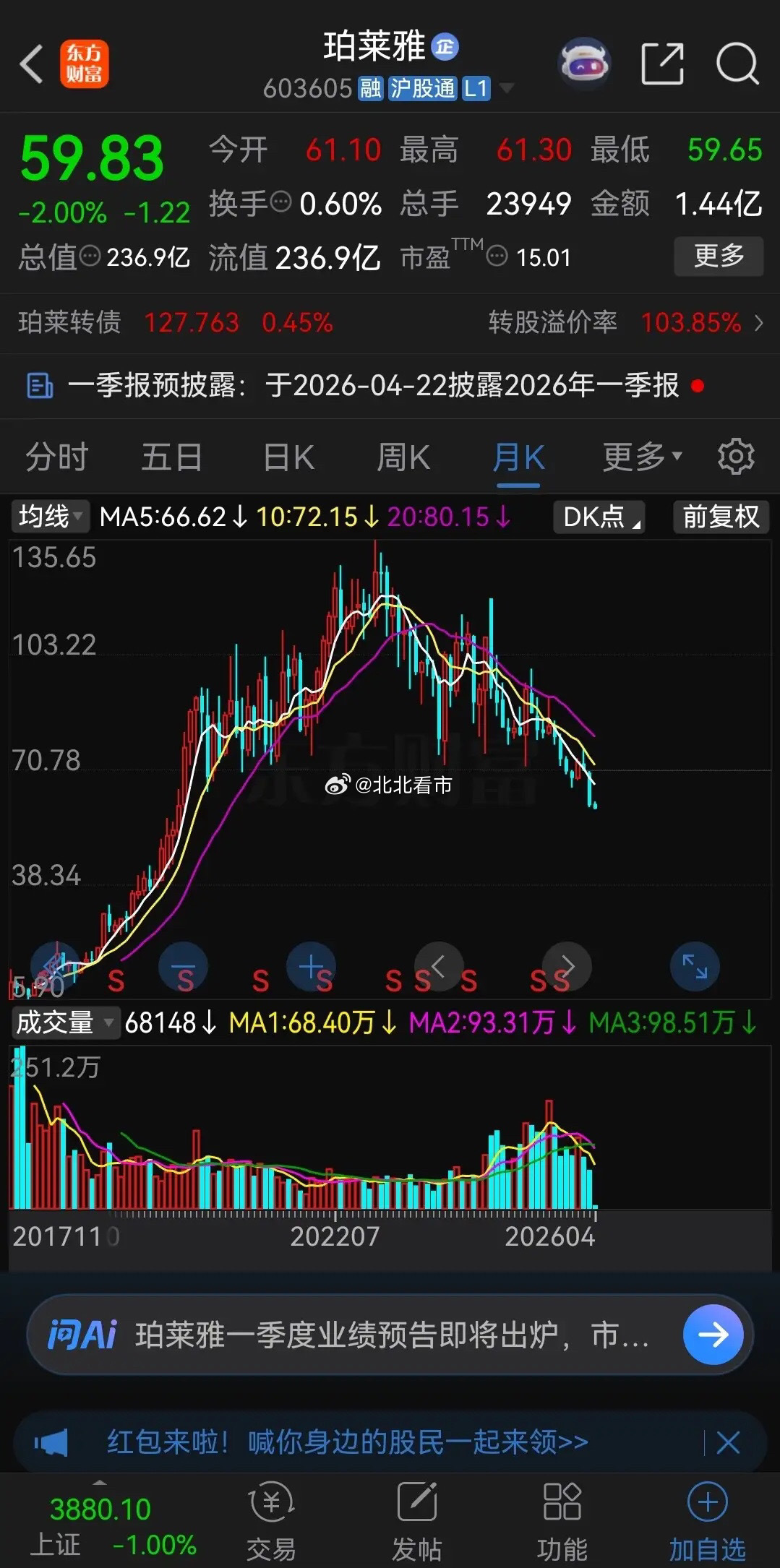 刚才翻看到珀莱雅的走势,吓我一跳!这个号称化妆品第一股的公司,在这轮牛市中跌得惨不忍睹。2024年924行情爆发前,珀莱雅的股价最低是75.36元,当时大盘最低点2689点,如今大盘3880点,而珀莱雅的股价却跌到了59.83元,大盘涨了1200多点,珀莱雅却逆势下跌了21%。目前的价格相当于大盘2400点以下了,近6年以来进场的股民全部被套牢。