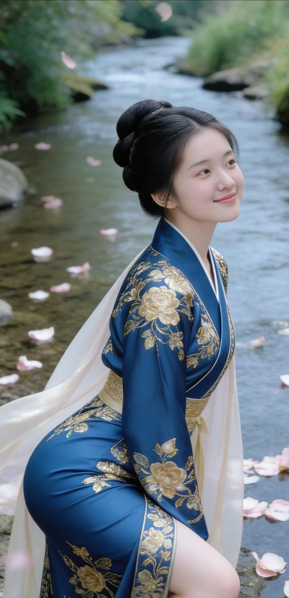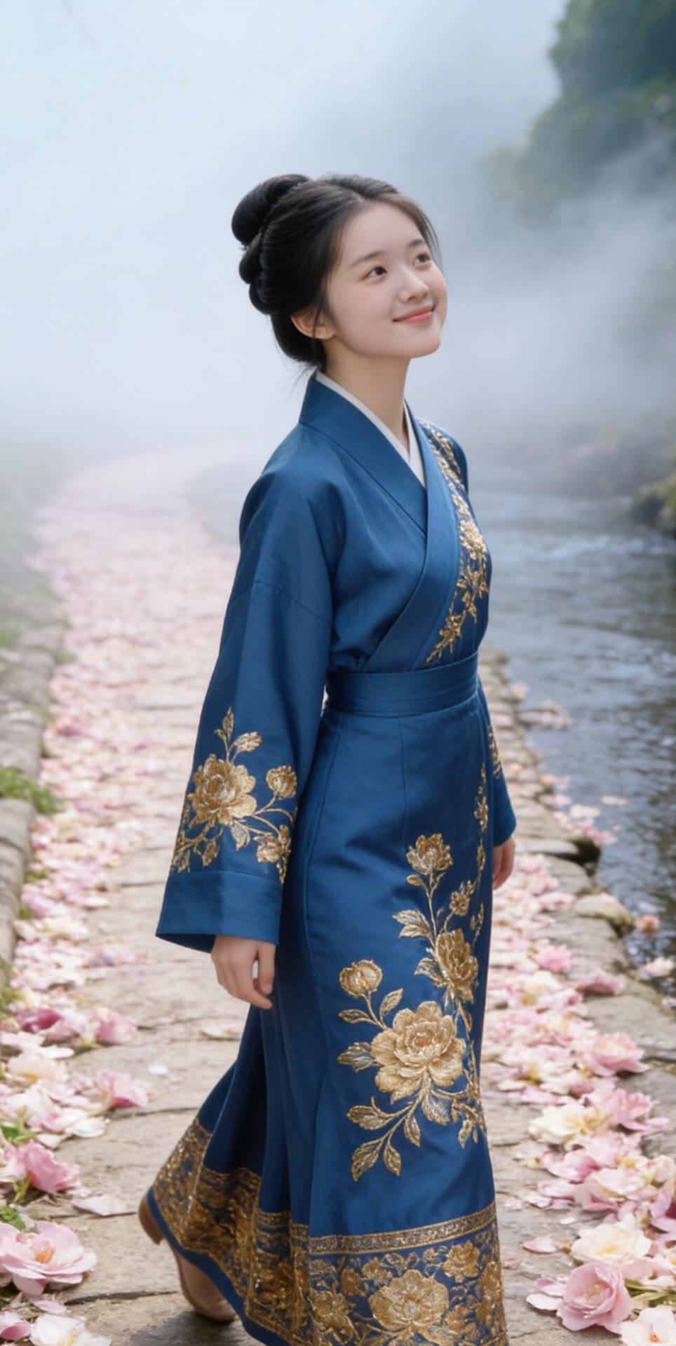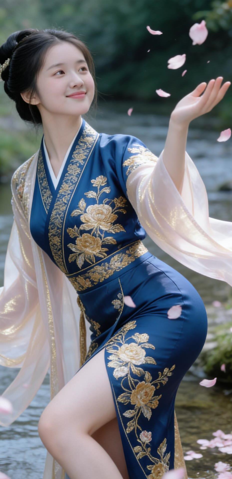 古典美人漫步花径,蓝衣金花,韵味十足!