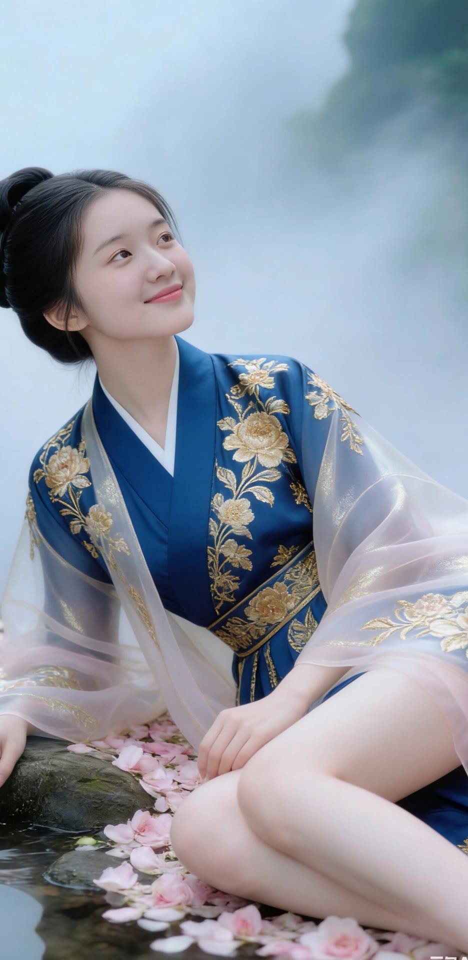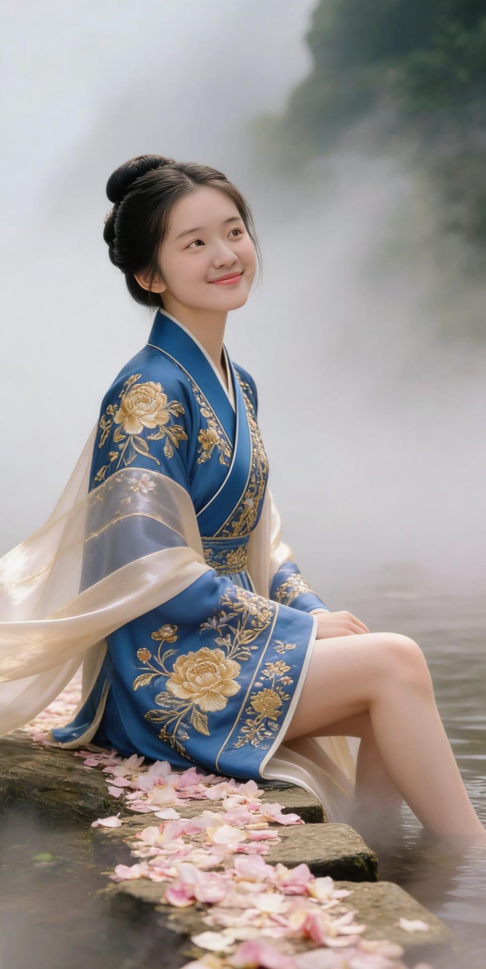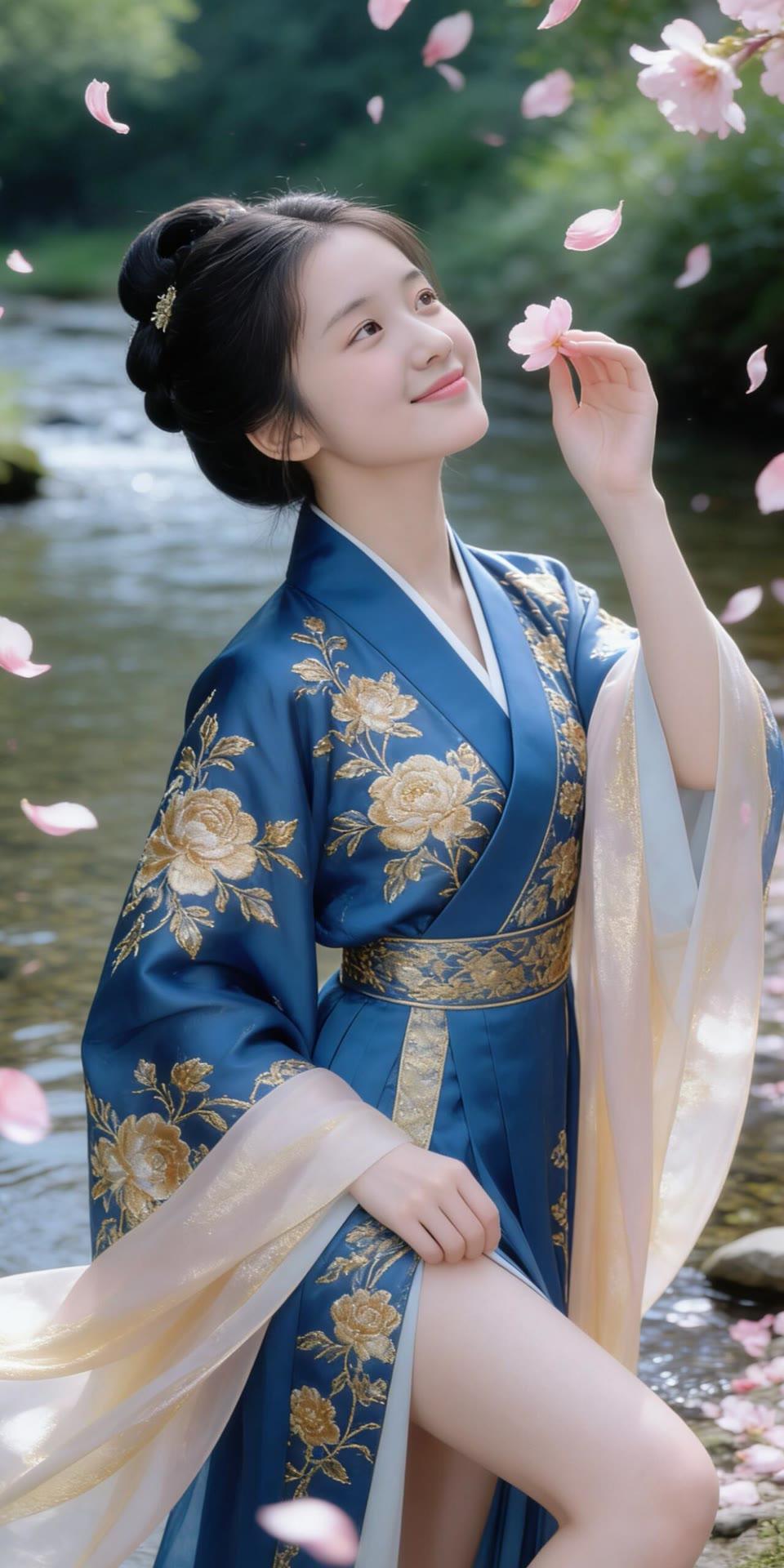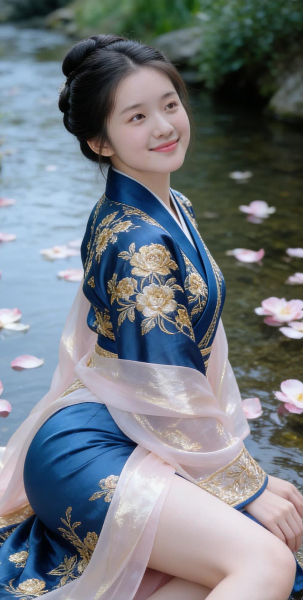 古典美人漫步花径,蓝衣金花,韵味十足!