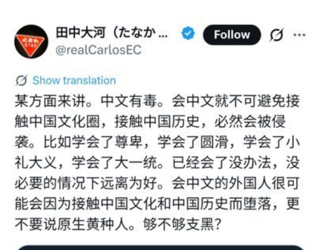 这个润日的博主,曾经声称中文有毒,于是不让孩子接触中文,然而他女儿喝除草剂自杀,不知道有没有抢救过来。