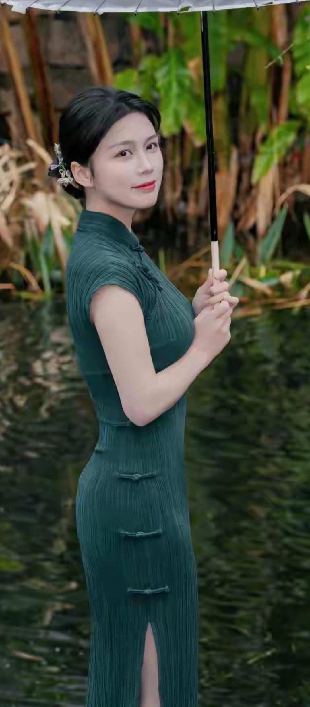 竖条纹旗袍的开叉恰到好处,衬得腿型修长,线条舒展而柔和;肤色均匀且细腻,姿态优雅