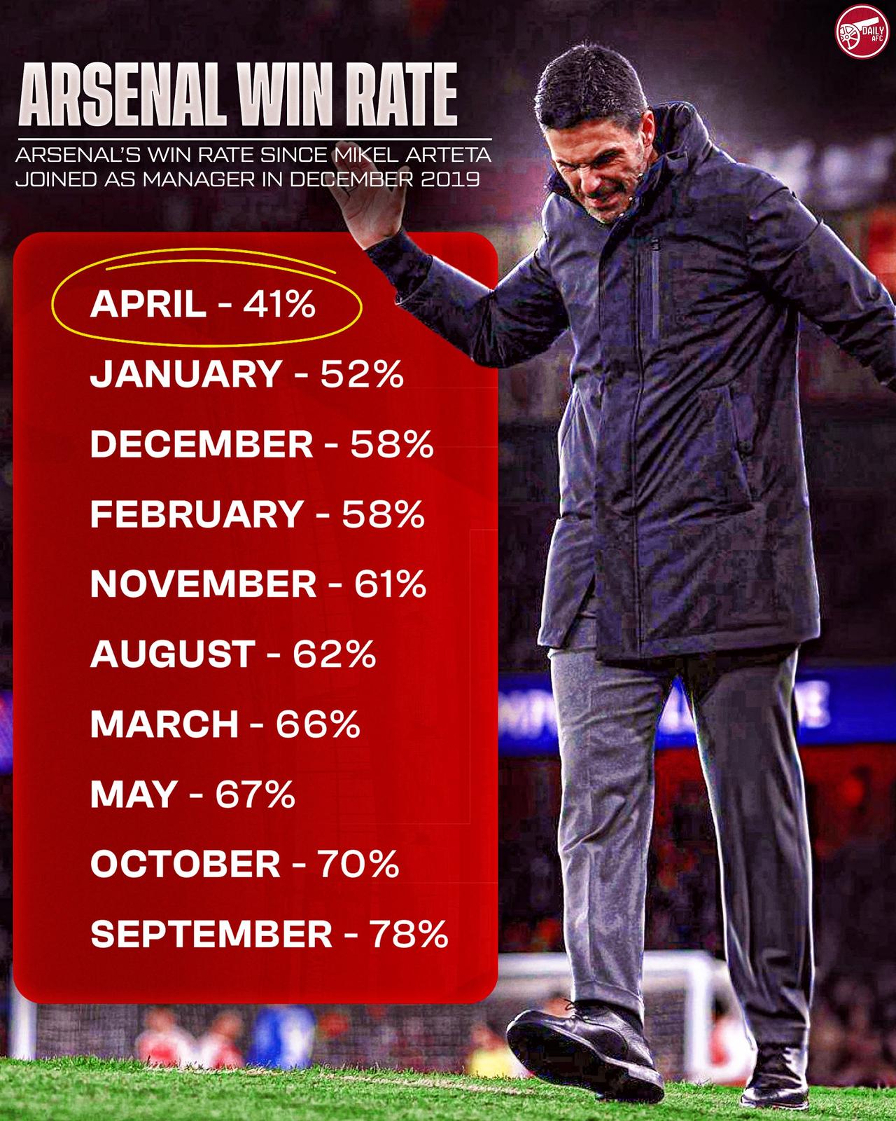 历史数据显示,自阿尔特塔执教以来,阿森纳4月份的胜率是所有月份中最低的,只有可怜的41%,不及5成,而4月份恰恰是每个赛季夺冠最关键的月份。关键仗、硬仗踢得不好,这也解释了阿森纳为何过去三个赛季虽然前半程发挥出色但最后只能屈居亚军。这不能不让人担心,四月份的7场比赛,如果按照41%的胜率,他们至多只能拿到三场胜利。今年如果依然这个胜率的话,恐怕就是陪曼城这个太子读书了,好在阿森纳本赛季的表现是明显好过于过去几个赛季。 ❌ 南安普顿(足总杯) ✈️ 葡萄牙体育(欧冠) 🏡 伯恩茅斯(英超) 🏡 葡萄牙体育(欧冠) ✈️ 曼城(英超) 🏡 纽卡斯尔联(英超) 🏡 富勒姆(英超)