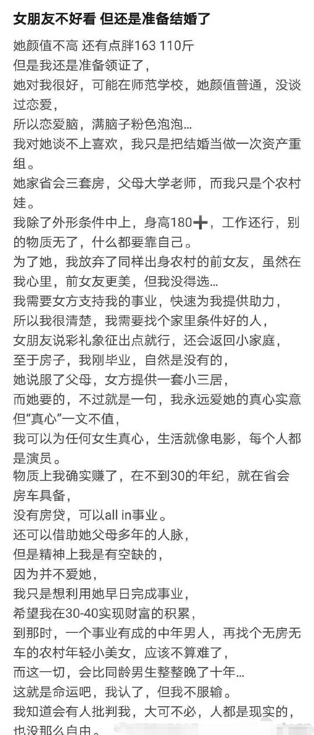 网友吐槽:女朋友不好看,但还是准备结婚了。不要担心,爱情会慢慢长大。