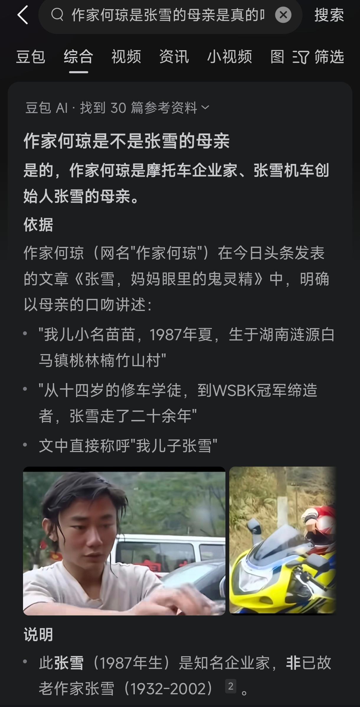 张雪有一个做农机维修工的父亲和一个当作家的妈妈。这就能解释通为什么只是初中毕业的张雪修车造车的水平这么牛,而且他的表达能力和认知能力还那么高。父母的这种组合的基因传承加成长环境,是后来张雪能够成功的关键因素。举个例子,小时候张雪的妈妈回家看儿子,给儿子买了一辆儿童车。张雪喜欢的不得了,但是儿童车玩了没半天,他就出于好奇车的结构是怎样的,就把车全部拆的七零八落。但更神奇的是,拆完之后,他能记得组装顺序,然后就又把车组装的完好如初了。 这就是父亲作为维修工,张雪耳濡目染之下,让他对机械的敏感度异于常人。 换句话说,父亲作为维修工的动手能力,机械天赋是张雪爱拆爱装,能吃苦、务实,懂工程逻辑的底层基因,也成了张雪的硬实力。 而他的母亲何琼女士,高中文化,跟张雪的父亲分开后来到福建发展,自考的厦门大学中文专业,后来的工作是采编、作家,成了知识分子。张雪从母亲这里也得到了软实力基因,那就是表达能力,认知能力不一般。而且非常有韧性,敢想敢干,认准目标后,不会被他人的看法所干扰。 作家母亲的高认知和在背后的托举,让他不止是个修车工,而是能创业,做产品,做品牌、做战略、闯世界赛场的软件灵魂。 父母的传承合在一起就是:工科动手基因 + 文科认知格局 = 既能造东西,又能看懂时代、踩对周期。 维修工的踏实落地 + 作家的远见判断,在他身上长出来了。 简单说:父亲给了他一双灵巧的手,母亲给了他聪明的大脑和胆识。缺任何一个,他大概率都走不到今天这一步。