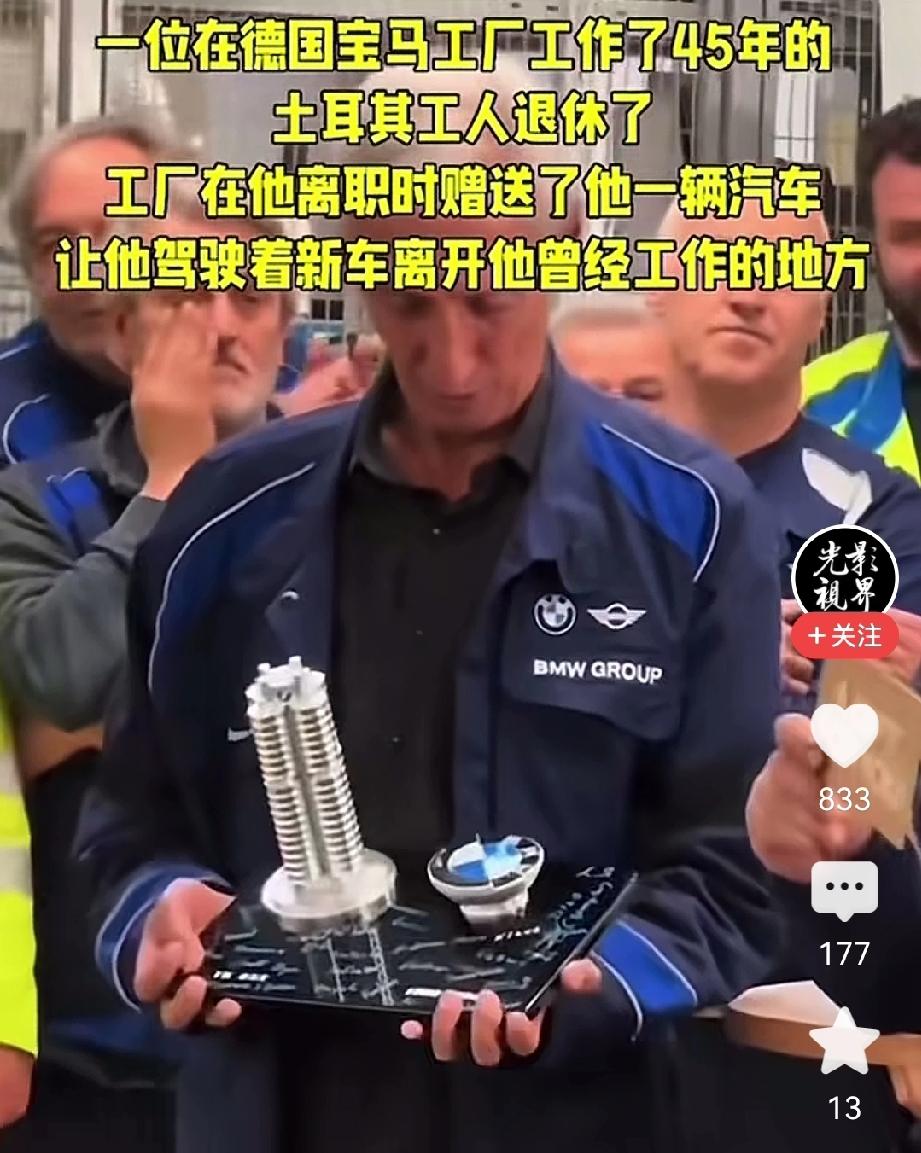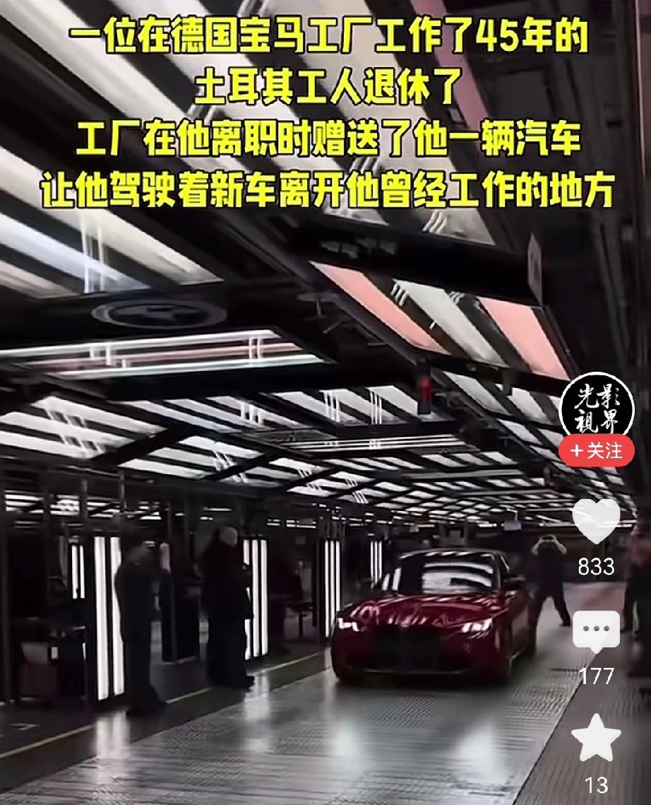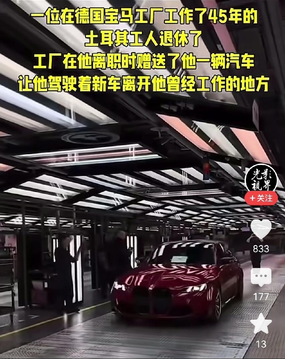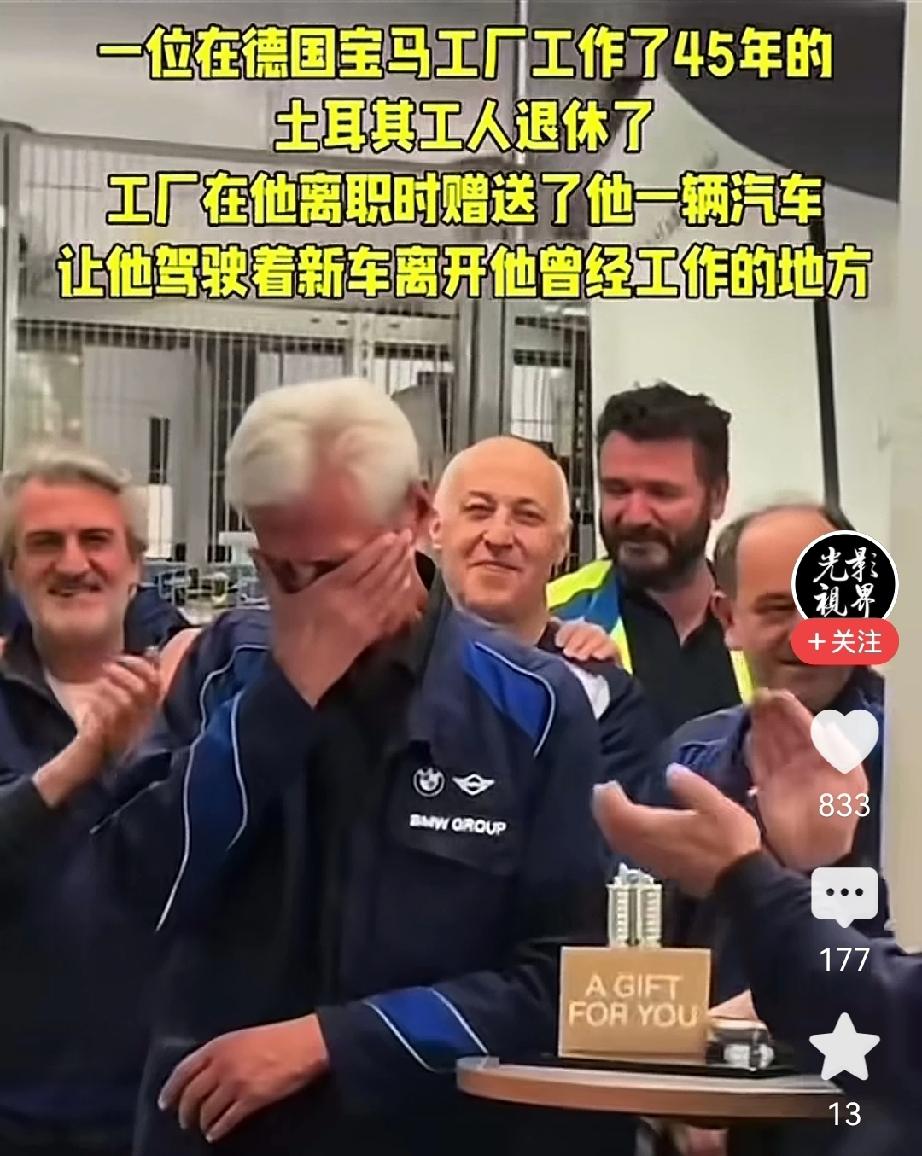 这样的企业才是真正的企业,这样的企业的领导才是真正的企业家,事实证明,不是所有公司的领导都是企业家,绝大多数都是作坊主而已。 一位在德国宝马工作了四五年的土耳其工人退休,工厂在他离职时送了他一辆新车,让他驾驶着新车离开,他曾经工作的地方。 是的,大家没有看错,小编也没有说错,现在这位老员工在宝马工作了四五年,没有被企业想方设法的裁退。而是一直工作到退休。 退休的时候,公司还额外奖励了一辆宝马新车,看一个社会是否是文明社会?这才是标准。