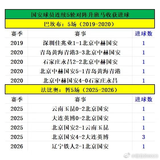 ⚽法比奥成为队史继巴坎布之后,队史第2位在中超联赛中连续5场对阵升班马对手都有进球的球员。【图5】📊巴坎布、法比奥对阵升班马连场进球一览。