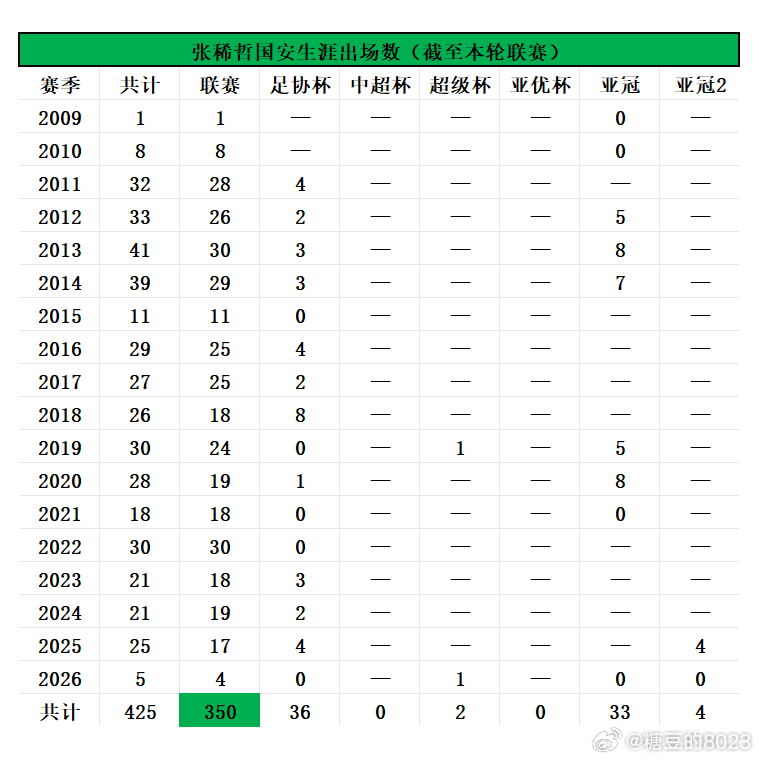 💚本场是张稀哲为国安出战的第350场联赛,联赛出场数追平杨智并列队史第2位。【图6】📊张稀哲350场联赛分布。
