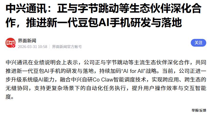 曝中兴正在推进新一代豆包手机落地 据媒体报道,在业绩说明会上,中兴通讯方面表示:正与字节跳动等主流生态伙伴深化合作,共同推进新一代豆包AI手机的研发与落地,持续加码“AI for All”战略。 在这样的背景下,中兴内部也正在加强系统级AI能力,并逐步实现跨应用、跨生态的无缝协同。