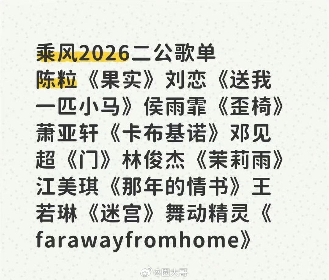 网传浪姐7二公歌单 《乘风2026》一公分组刚播完,就有二公歌单的消息出来了,看得出来节目组这是一刻也不想让姐姐们休息啊,二公舞台会选陈粒、林俊杰、王若琳还有江美琪等歌手的代表作,一整个期待拉满了!曝乘风2026二公歌单