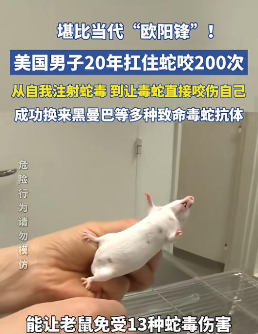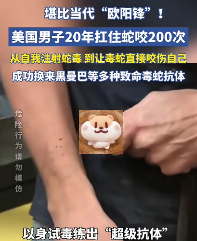 “活久见!”美国,一男子出于对毒蛇的好奇,开始少量注射蛇毒,并且慢慢加大剂量,最后还直接让毒蛇咬伤自己,在20年间,他主动被一些剧毒蛇咬伤超200次,就这样,他的血液产生抗体,并被用于实验性抗蛇毒研发!网友:是个狠人!   这位男子是名爬行动物学家,从小就对蛇类有着异于常人的兴趣,这份兴趣在他30岁时,有了更极端的延伸。   30岁时,他报名了采集蜘蛛和蝎子毒液的专业课程,也是在这里,他第一次接触“自我免疫”的概念,一个大胆的念头油然而生:人类身体能不能通过反复接触蛇毒,练出抗毒免疫力?   为了实现这个想法,他在自家地下室打造了“毒蛇饲养区”,养了60条来自世界各地的剧毒蛇,包括“非洲死神”黑曼巴、毒液量极大的眼镜王蛇,还有虎蛇、埃及眼镜蛇等,每一种都能轻易夺走普通人的生命。   实验初期他很谨慎,先将稀释的蛇毒用注射器注射到体内,每天记录身体反应,从轻微头晕、皮肤红肿,到慢慢适应,再逐步加大剂量。   随着身体对蛇毒耐受度提高,他不再满足于稀释注射,而是直接抓住毒蛇,让它们咬在自己手臂、手指上,每一次咬伤都伴随着钻心疼痛和生死考验。   这份冒险,他一坚持就是20年。   20年间,他被咬伤超200次,每一次都像在鬼门关前徘徊,其中两次经历,差点让他再也醒不过来。   采集埃及眼镜蛇毒液时,他左手中指不幸被咬伤。   未及妥善处理,一小时内,孟加拉眼镜蛇又咬穿其肱二头肌,剧毒迅速扩散。他当场全身瘫痪、意识模糊,连呼救之力都已丧失。   万幸的是,动物园及时送来抗蛇毒血清,把他从鬼门关拉了回来。   还有一次,他被眼镜蛇咬伤后陷入昏迷,在ICU躺了四天,醒来后依旧心有余悸。   这些致命危机没有让他退缩,反而让他更加坚定,开始自学免疫学知识,详细记录每一次咬伤的反应、蛇毒剂量和身体变化,更系统地推进实验。   长期反复的蛇毒侵袭,终究让他付出了沉重代价。   因中毒过深,他的手指坏死,不得不截掉部分手指,也因此放弃了以身试毒,但此时他体内已形成两种超级抗体,这是他20年冒险最珍贵的收获。   和很多人想的不一样,他做这一切不是为了逞强博眼球,也不是为了练“抗毒神功”,而是真心想为抗蛇毒研发出一份力。   他主动联系研究人员,全力配合研究,主动提供血液供科学家提取抗毒素抗体,希望能为破解全球抗蛇毒血清短缺难题提供思路。   全球每年有270万人被毒蛇咬伤,30万人因此残疾,最多13.8万人死亡,仅印度每年就有5万人死于蛇咬伤,占全球一半。   常规抗蛇毒血清研发多依赖马等大型动物产生抗体,过程慢、成本高还可能有副作用,偏远地区更是难以获得对症血清,被咬后往往只能等待死亡。   科学家从他血液中提取出两种超级抗体,与毒素阻断药物混合实验后,结果令人惊喜——这种混合血清能完全保护小鼠免受13种毒蛇伤害,对另外6种也能提供部分保护,涵盖全球最致命的蛇类,这是抗蛇毒研发的重要突破。   不得不承认,他的勇气令人敬佩,用自己的身体为医学研究提供了珍贵样本,为被蛇咬伤的患者点亮了一线生机,这份执着和奉献值得铭记。   但他的成功是极端偶然的幸运,20年间200多次咬伤每一次都可能致命,他付出了中毒、昏迷、截手指的代价,这样的冒险毫无可复制性。   网友直呼他“是个狠人”,却很少有人知道,这份“狠”的背后,是无数次与死神擦肩而过的侥幸,是身体和精神的双重折磨。   我们不能因他的“成功”忽视风险,更不能模仿——普通人被毒蛇咬伤,不仅练不出抗体,还会快速陷入危险,甚至失去生命。   说到底,他的20年冒险只是个极端案例,价值不在于证明“人能练出抗毒体质”,而在于为科学研究打开了新大门。