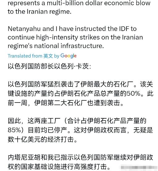 炸炸炸!坚决要把美国拖住,以色列下死手了!4月6日,在刚传出伊朗与美国进行接触性谈判之后,以色列出突然攻击伊朗石油设施了。以色列国防部长以色列·卡茨宣布,以色列国防军对伊朗最大的石化厂进行了猛烈的袭击。这个关键设施占伊朗石化产量的约50%。此前,伊朗第二大设施上周遭到袭击。 伊朗这两大石化设施可不是普通目标,加起来占了全国石化产量的85%,现在全停了,数十亿美元的损失只是明面上的。 要知道,石化产业是伊朗非石油出口的支柱,占了这类收入的25%,不光能赚外汇,还能给纺织、汽车零部件这些行业提供原材料。 以色列一炸,相当于直接掐断了伊朗的一条经济命脉,让伊朗就算想和美国谈判,也得先掂量掂量家底,谈判的底气自然就弱了。 更关键的是,以色列这么做,根本就是为了把美国牢牢绑在自己的战车上。 现在以色列国内的日子不好过,内塔尼亚胡的支持率跌到了23%,已经跌穿了生命线。 3月底的时候,支持战争的民众从74%降到了50%,每周都有示威游行,要求停火让质回家。 40万预备役被动员,工厂没人干活,经济几乎停摆,社会撕裂越来越严重。 以色列国土就那么大,最窄的地方才15公里,没什么战略回旋的余地,90%的自来水靠海水淡化,80%以上的粮食和石油都得进口,一旦关键设施被砸,很可能就面临断粮断水的危机。 这种情况下,内塔尼亚胡很清楚,光靠以色列自己撑不下去,必须拉美国下水。 他已经主动邀请美国在以色列建永久军事基地,就是想把美国的利益和以色列的生存绑在一起。 现在美伊要谈判,一旦双方缓和,美国可能就会放松对伊朗的制裁,甚至减少对以色列的支持,这是以色列最不能接受的。 所以趁着谈判刚有苗头就动手,制造既成事实,让伊朗恨上加恨,美伊谈判自然就很难推进。 就算谈不成,伊朗要报复,大概率会连美国一起算上,到时候美国就算不想打仗,也得为了自己的利益出手帮以色列。 以色列的打击目标也选得极有针对性,之前已经摧毁了伊朗70%的钢铁产能,现在又专攻石化设施,都是冲着伊朗的工业根基来的。 他们的想法很明确,不光要打疼伊朗,还要让伊朗战后恢复变得漫长又痛苦。 只有伊朗的军事和经济实力被大幅削弱,才不会对以色列构成威胁。 而且以色列早就放话了,要彻底打掉伊朗的导弹能力和核能力,现在攻击基础设施,就是这个战略的延续。 美国的态度也很耐人寻味,一边和伊朗谈停火协议,一边又在准备“史诗怒火”行动的第二阶段,还打算抽调几乎全部的增程型联合防区外空对地巡航导弹库存。 特朗普虽然推迟了打击伊朗的最后期限,但还在威胁要炸伊朗的桥梁和发电厂,说让伊朗20年都重建不完。 这种既谈又打的姿态,其实也给了以色列动手的底气,让以色列觉得自己的行动能得到美国的默许。 不过以色列这么干,也把局势推向了更危险的边缘。 伊朗已经放出话,要封锁霍尔木兹海峡,甚至还要封锁曼德海峡,一旦这些关键航道被堵,全球能源价格肯定会暴涨。 现在油价已经涨到2022年以来的最高水平,要是航道再出问题,后果不堪设想。 伊朗的反击也没闲着,用无人机和导弹袭击了以色列的石化设施、美军基地,还有海湾国家的相关目标,科威特的石油综合体都已经着火了。 现在地区调解方还在努力推动45天的停火协议,但成功的可能性不大。 伊朗已经明确表示不接受当前的临时停火安排,以色列也没打算停手,还在计划继续打击伊朗的国家基础设施。 这场冲突已经持续了五周,影响还在不断外溢,不光美以伊三方被卷进来,阿联酋、巴林、科威特这些周边国家也遭到了袭击,无辜平民伤亡越来越多。 说到底,以色列这波操作,本质上就是用极端手段破坏美伊缓和的可能,以牺牲地区稳定为代价,换取美国的持续支持,从而保住自己在中东的地位。 但这么做的后果,是让整个中东陷入战火,全球能源市场也跟着动荡,最终到底谁能占到便宜,还真不好说。