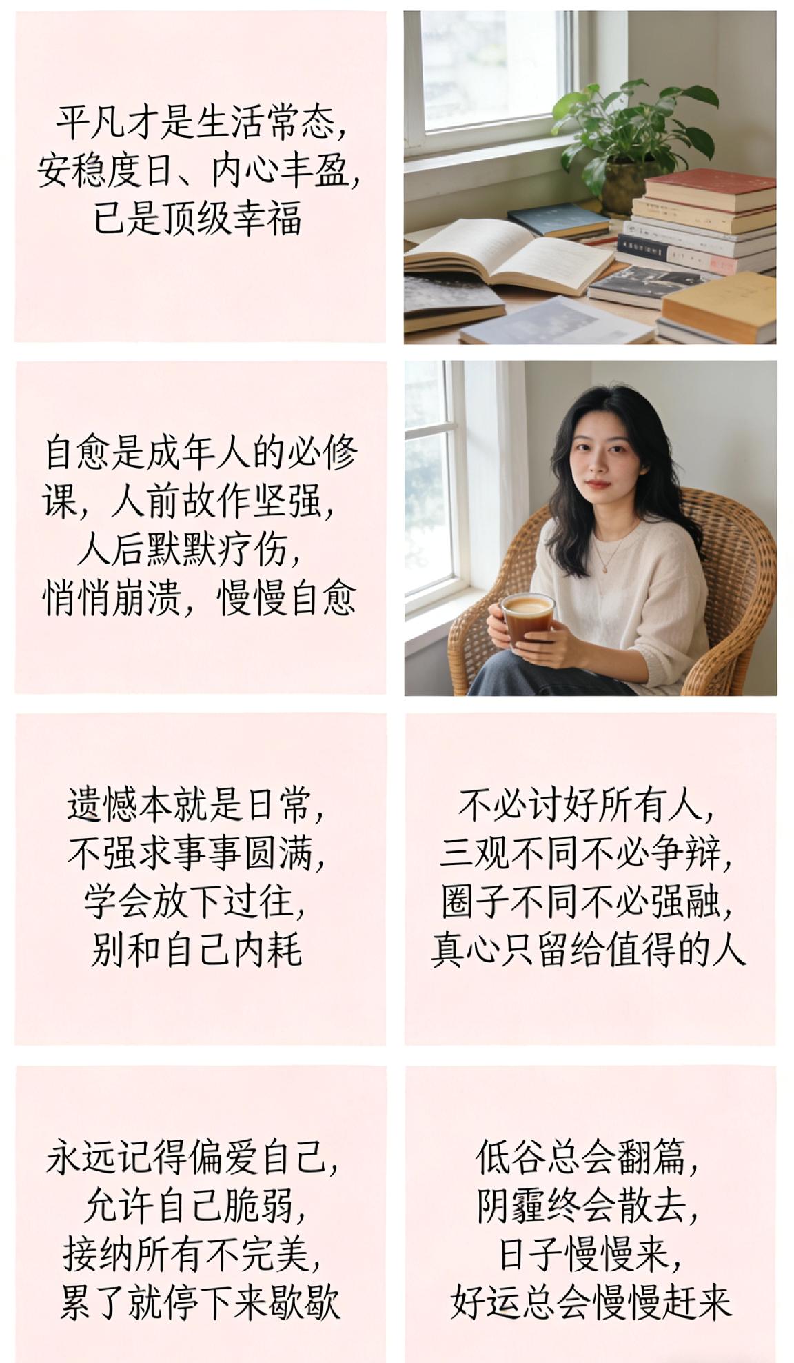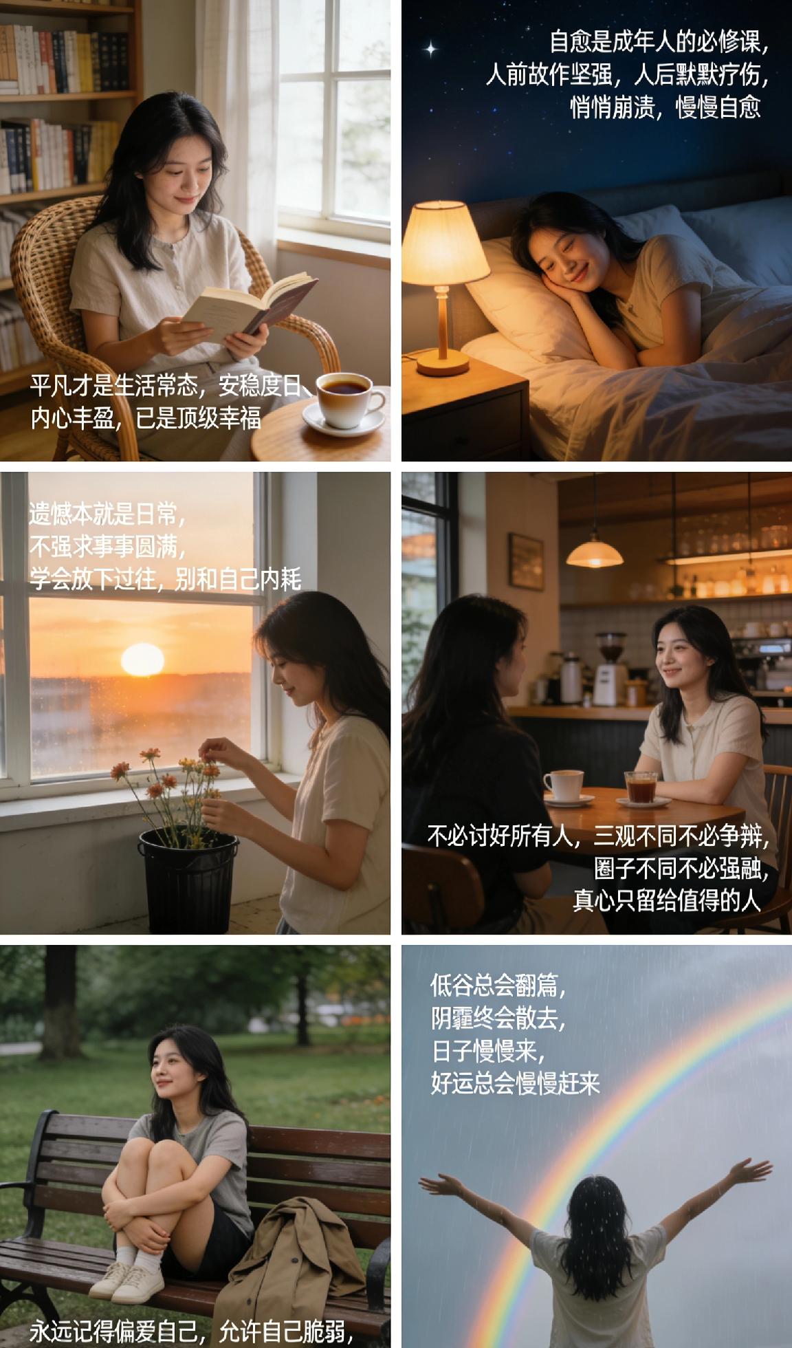 慢慢长大才懂,人生不过是一场边走边悟的温柔旅程✨ 1. 平凡才是生活常态,安稳度日、内心丰盈,已是顶级幸福 2. 自愈是成年人的必修课,人前故作坚强,人后默默疗伤,悄悄崩溃,慢慢自愈 3. 遗憾本就是日常,不强求事事圆满,学会放下过往,别和自己内耗 4. 不必讨好所有人,三观不同不必争辩,圈子不同不必强融,真心只留给值得的人 5. 永远记得偏爱自己,允许自己脆弱,接纳所有不完美,累了就停下来歇歇 6. 低谷总会翻篇,阴霾终会散去,日子慢慢来,好运总会慢慢赶来 余生不长,好好善待自己,认真生活,一切皆有回甘❤️ 人生感悟 治愈自己 好好生活 人间值得