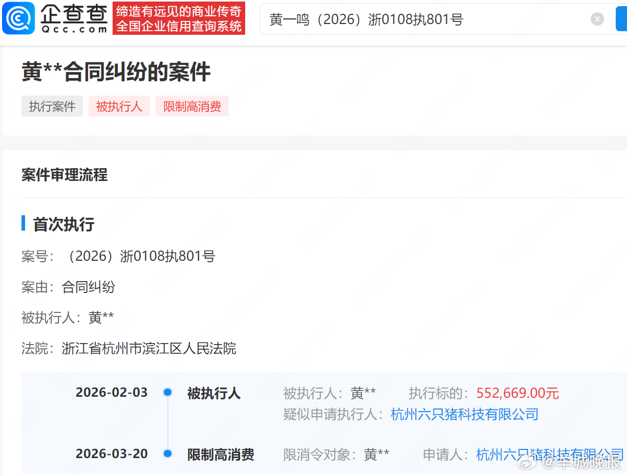 【#黄一鸣被执行55万#】#黄一鸣因合同纠纷被限高# 企查查APP显示,近日,黄