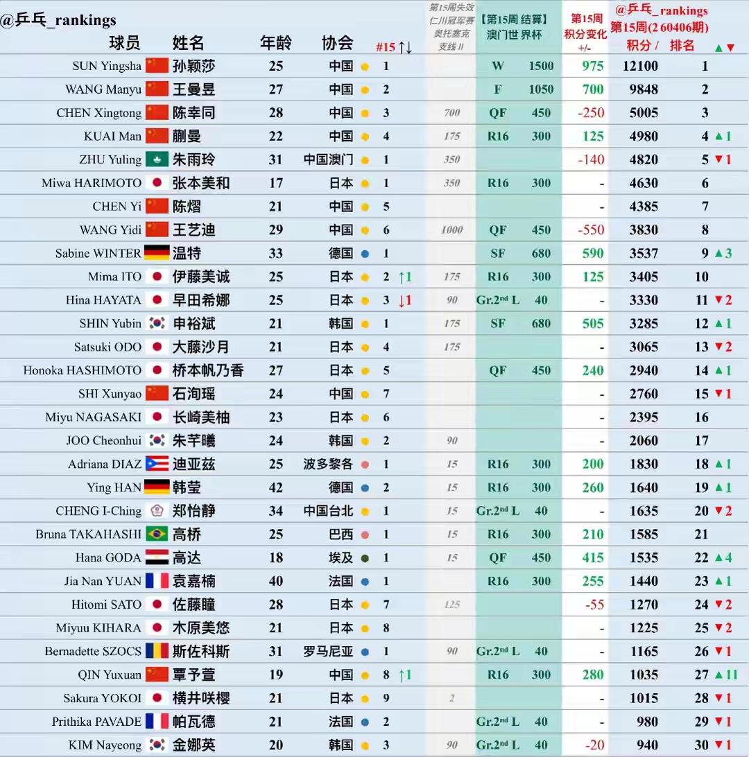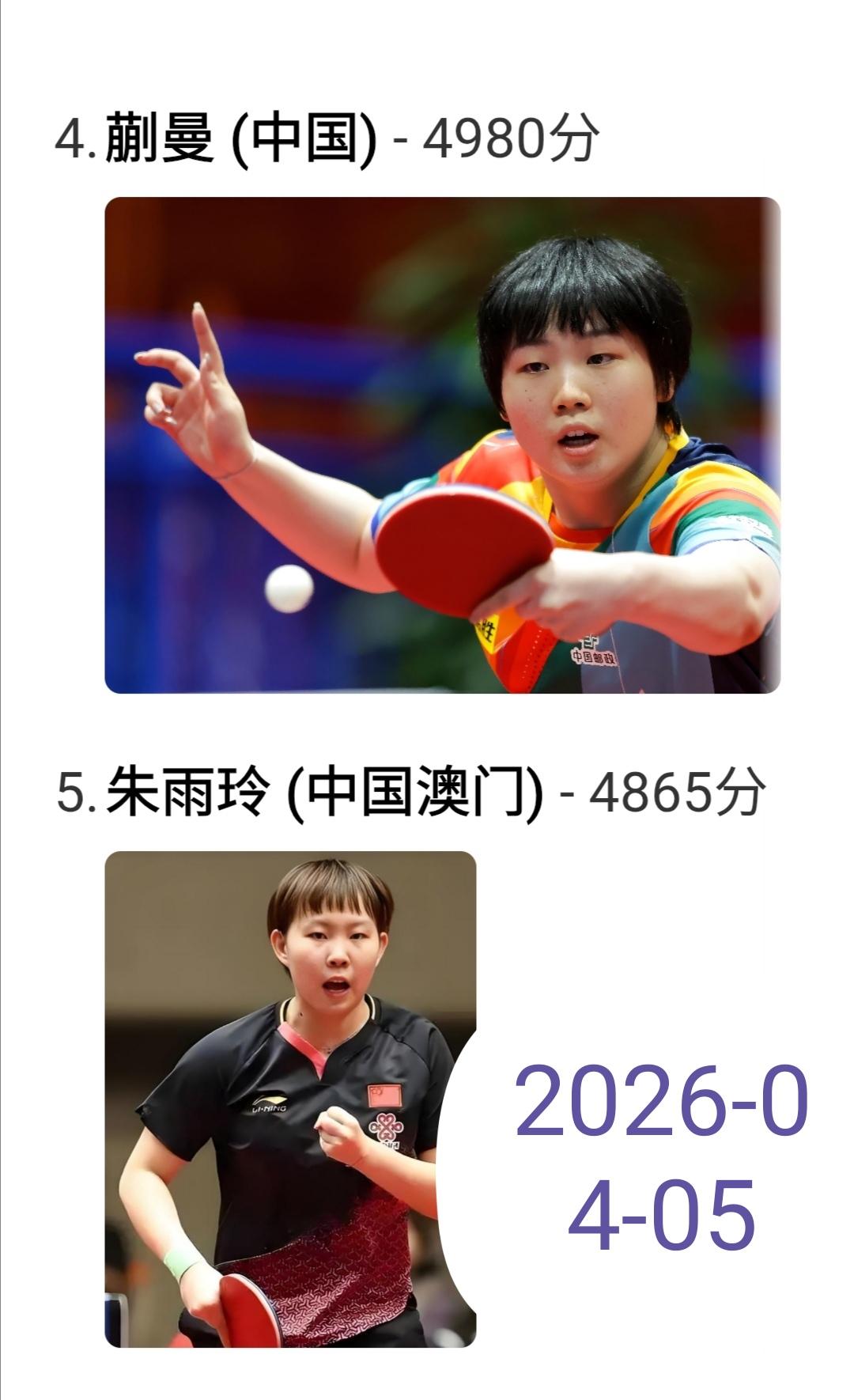 蒯曼要坚守女单排名前四的阵地! 今年2月WTT多哈冠军赛,中国澳门朱玉玲夺得冠军,挤下了单打世界排名第四的蒯曼,她上升到第四位,蒯曼降到第五! 由于规则制约,中国澳门朱玉玲不能参加ITTF澳门世界杯比赛! 而蒯曼由于单打世界排名第六、赛会5号种子,没有资格成为四大种子位! 蛇形抽签、同协会避让,所以蒯曼抽签落到1/4区,和孙颖莎同区! 2025澳门世界杯冠军孙颖莎、亚军蒯曼。 2026澳门世界杯1/8决赛,去年女单冠军、亚军对决就提前了,蒯曼2:4负队友孙颖莎,从而止步16强! 从亚军陡降为16强,就是因为单打世界排名不是前四,没有自己的1/4区! 不少球迷都替蒯曼惋惜,签位不好,一上来就碰上了世界排名第一的莎莎! 而国际乒联最新一周女单世界排名昨日公布,蒯曼重回世界女单排名第四! 蒯曼排名“下”一位,这教训深刻! 蒯曼排名“上”一位,这是喜事! 但要巩固,牢牢占住前四位。 加油,蒯曼!