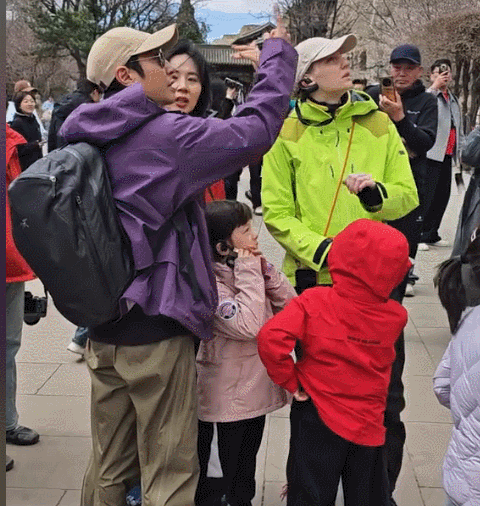 撒贝宁带着老婆孩子去景区游玩,被游客团团围住面露窘迫,相反老婆李白自顾自欣赏风景很专心。