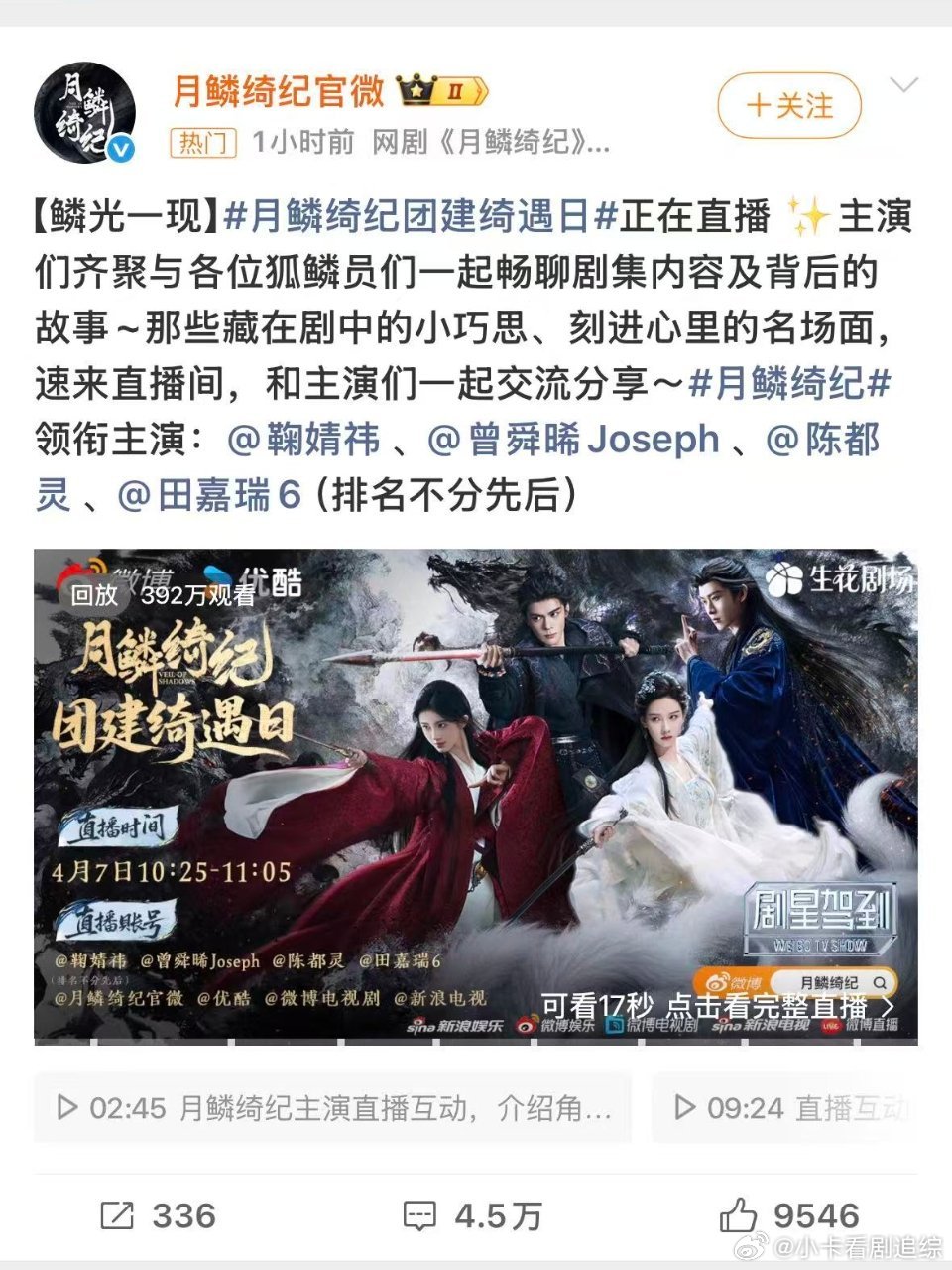 《月鳞绮纪》鞠婧祎是女主,戏份最多我能理解;田嘉瑞的戏份不少,我也能理解但我唯独