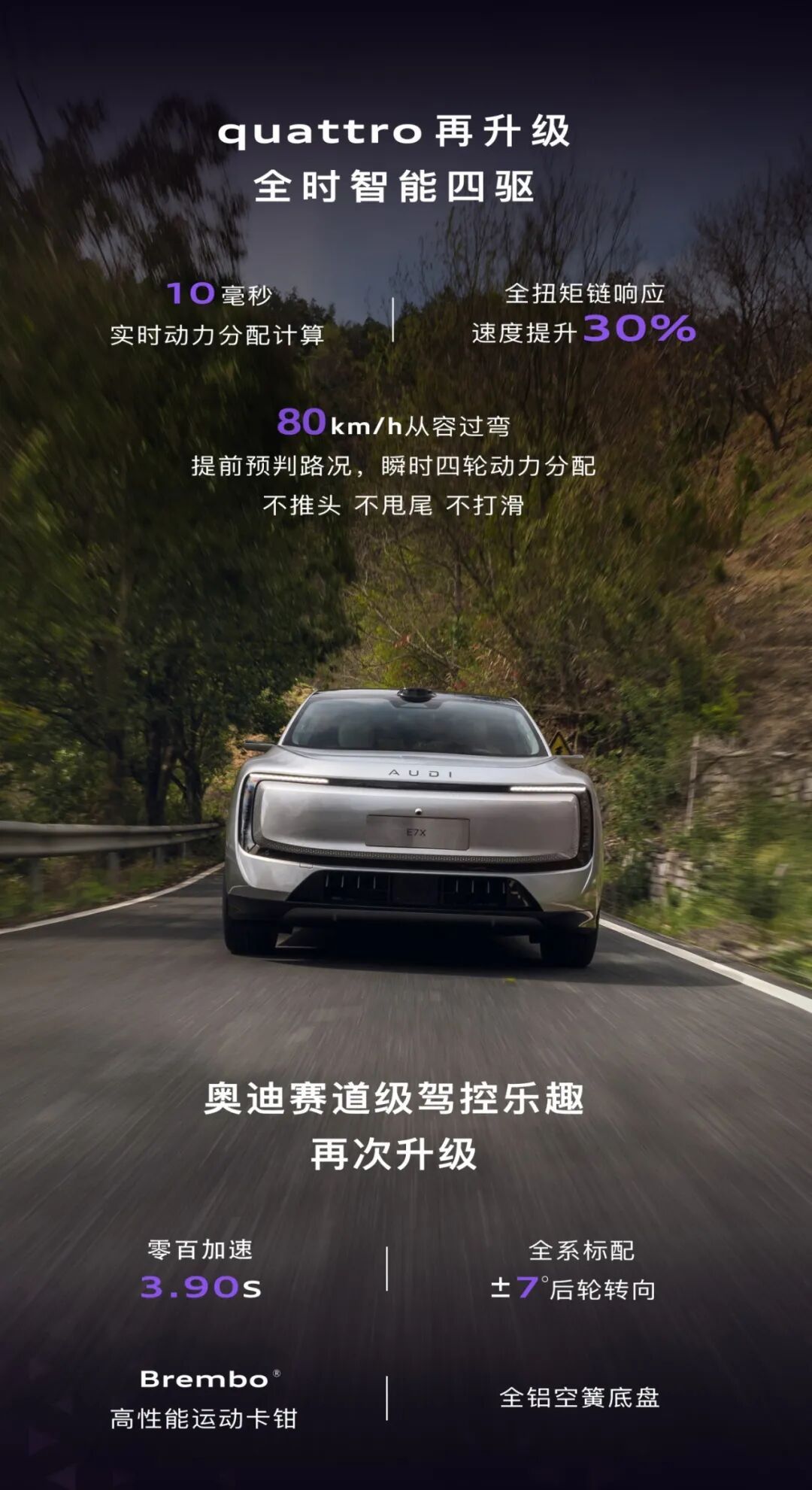 680匹马力,Brembo刹车卡钳,7度后轮转向,渐进式转向,全铝空簧底盘…………奥迪e7x新公路之王
