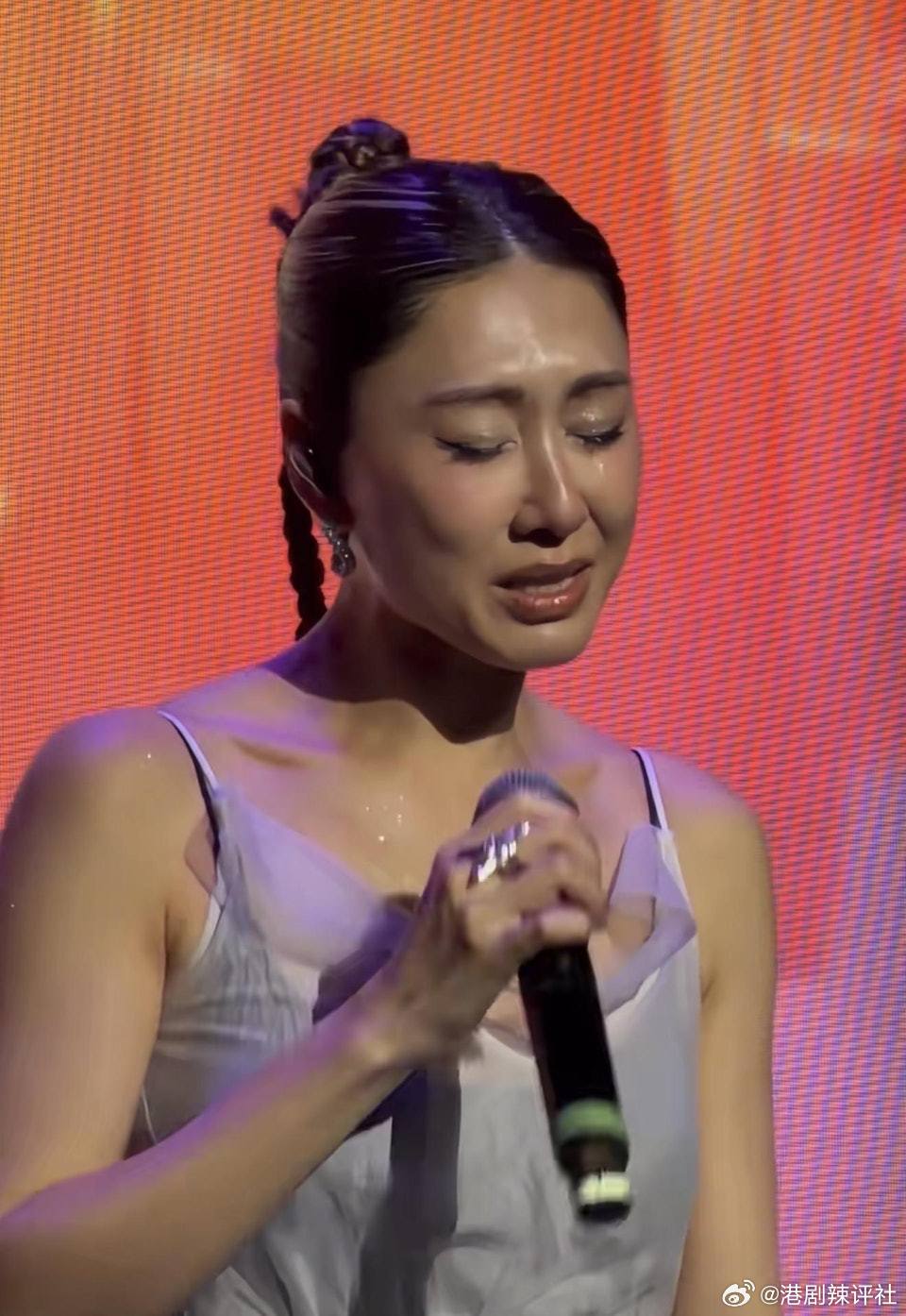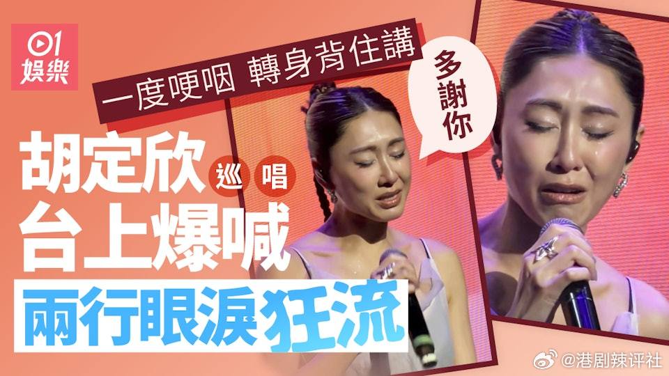 胡定欣喊到面容扭曲要调整情绪胡定欣近期在大湾区展开巡回演唱会演出,最近到珠海站举行演唱会,在现场演唱王菀之歌曲《好时辰》时,胡定欣似乎被歌词触动,中途突然在舞台上洒泪,而且喊到面容扭曲,要转身背向观众调整情绪,勉强唱下去。不少现场粉丝在台下为胡定欣打气,胡定欣表示:「多谢你!」才唱完最后一句。
