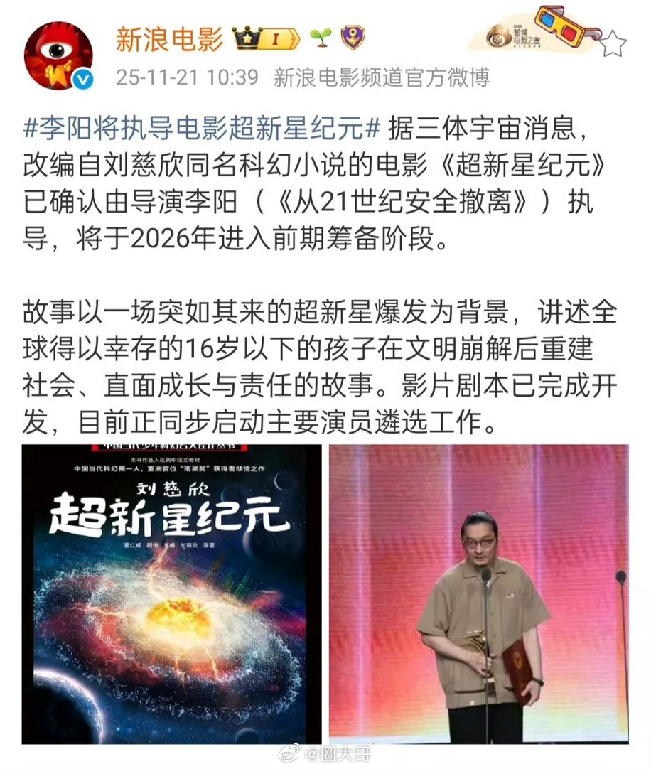 曝TF四代成员将演超新星纪元 TF四代的演戏道路这是打开了啊,网传TF四代要演电影《超新星纪元》。这也是刘慈欣三体宇宙的又一部科幻小说,主演是一群不到16岁的少年们,年龄和四代也能对得上,那就蹲一个官宣吧!网传TF四代要演电影了