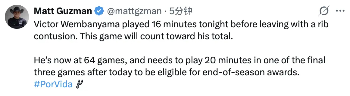 马刺记者Matt Guzman:文班亚马本场出战了16分钟,虽然因受伤退出了比赛,但也将计入他的总出场次数。