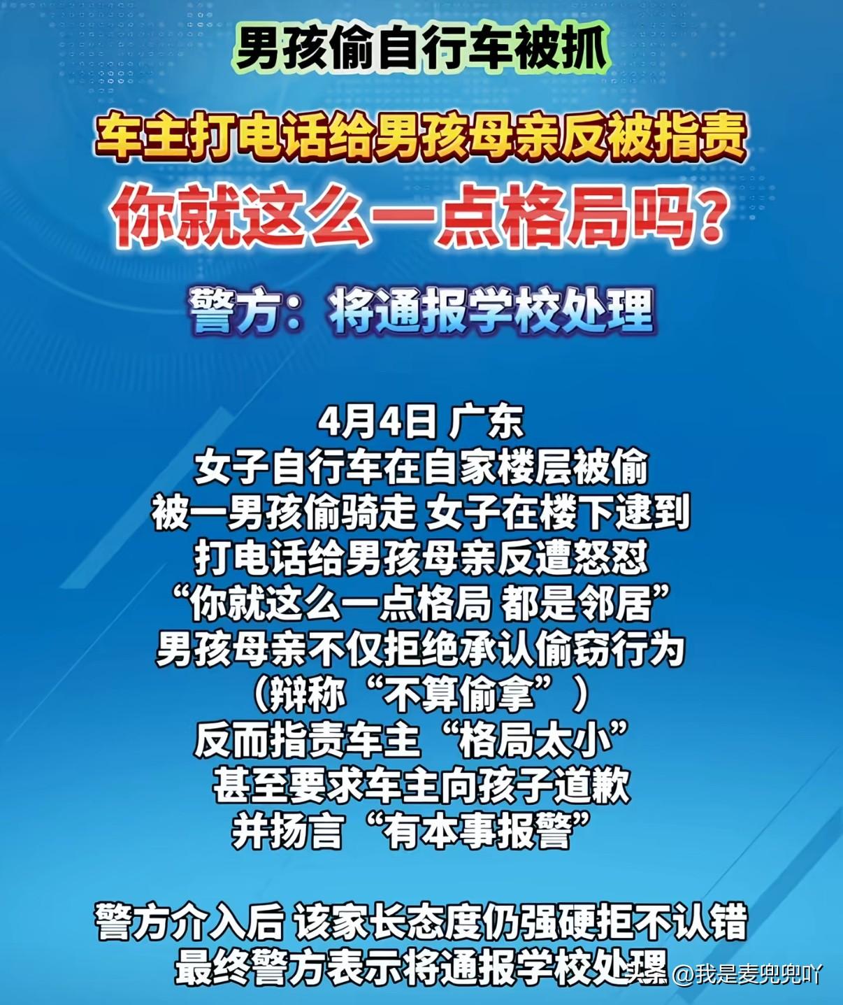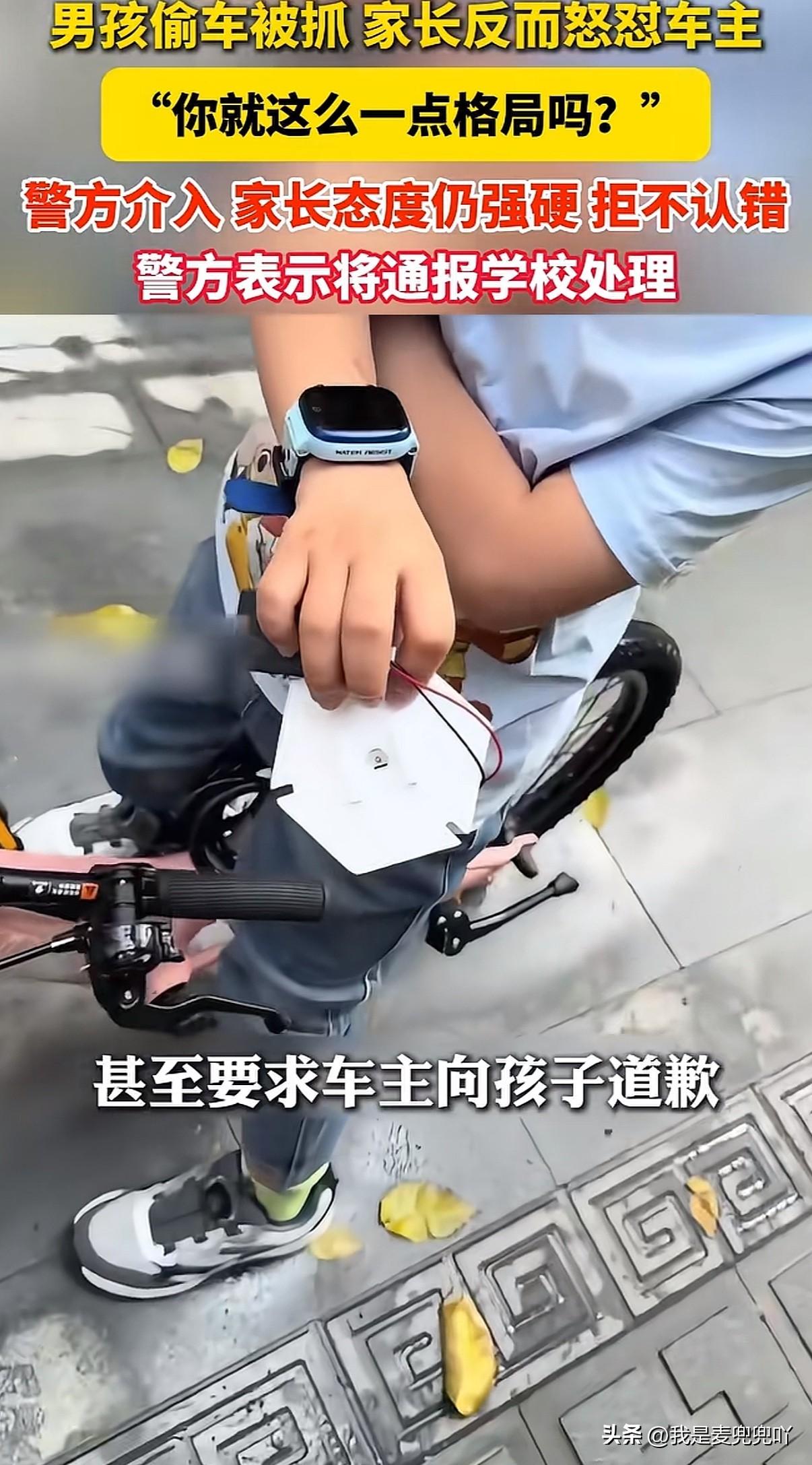 男孩偷车被车主抓包,本想找来家长教育两句结果家长却是个不讲理的,警察调解也撒泼最终通报男孩学校处理!真是个好妈妈👍 4月6号广东一小区内车主发现自己的自行车不见了找了很久抓到一名不认识的男孩在骑,找来男孩家长。男孩母亲到场后没有一句道歉的话反而不停指责车主没格局,跟一小孩计较什么?这就是骑一下说什么偷不偷的,这么污蔑她儿子车主必须道歉。不然这事没完 面对警察调解、这位护儿心切的母亲仍然态度强硬拒不认错,也不认为小孩不经车主同意就骑走车这属于偷窃行为,这样做是不对的 面对道理怎么都讲不通的男孩家长,警方也不惯着直接表示通报男孩学校处理 现在好了,不止全国都知道小男孩偷车了最最可怕的是小男孩同学也都知道他偷车了。这才是最可怕的,直接在校园内社会性死亡 这位不分是非对错一味护短的妈妈终是害了自己的小孩