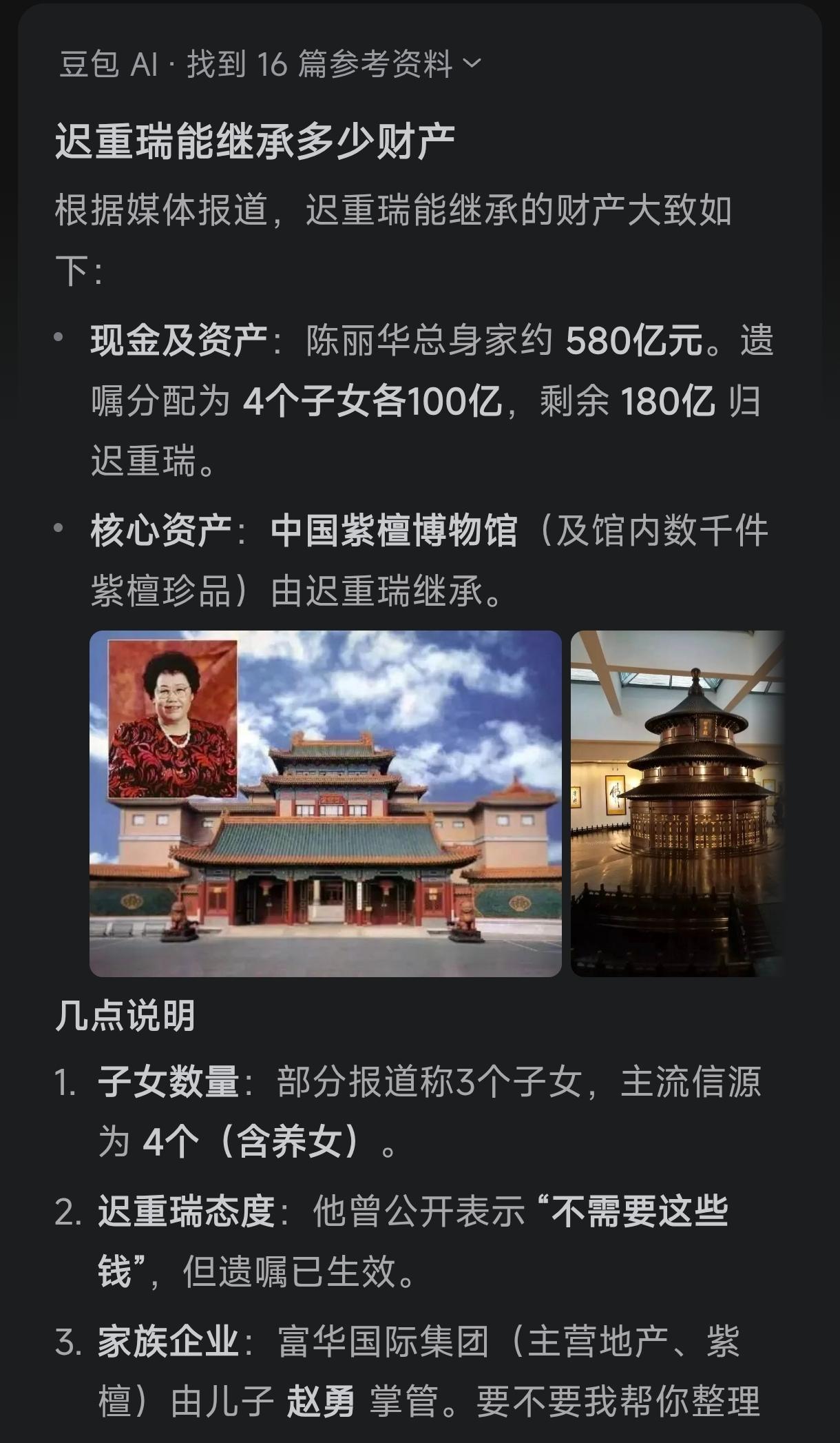 陈丽华女士去世了,迟重瑞可以获得180亿遗产外加一个紫檀博物院(按2019年陈丽华遗嘱)。虽然之前迟重瑞说不要这些身外之物,但是按照遗嘱,他不要也是他的。 其实陈丽华女士只比迟重瑞大11岁,俩人1990年结婚,当时迟重瑞38岁,陈丽华49岁,俩人年龄差距并不是很大。都说女大三抱金砖,迟重瑞才抱了三块半金砖而已。 两人携手并肩,相濡以沫36年,伉俪情深,感情不可谓不深厚。现在陈女士85岁去世,迟重瑞年纪也不小了,今年74岁了。 对于这个年纪的老人来说,他早就明白拥有再多财富也买不来长命百岁,也早已视金钱为身外之物。 唯有身体健康才是最重要的。 可人生变化无常,生命是不可预测的,谁也不知道意外和明天哪个先到,唯有活好当下,珍惜当下。