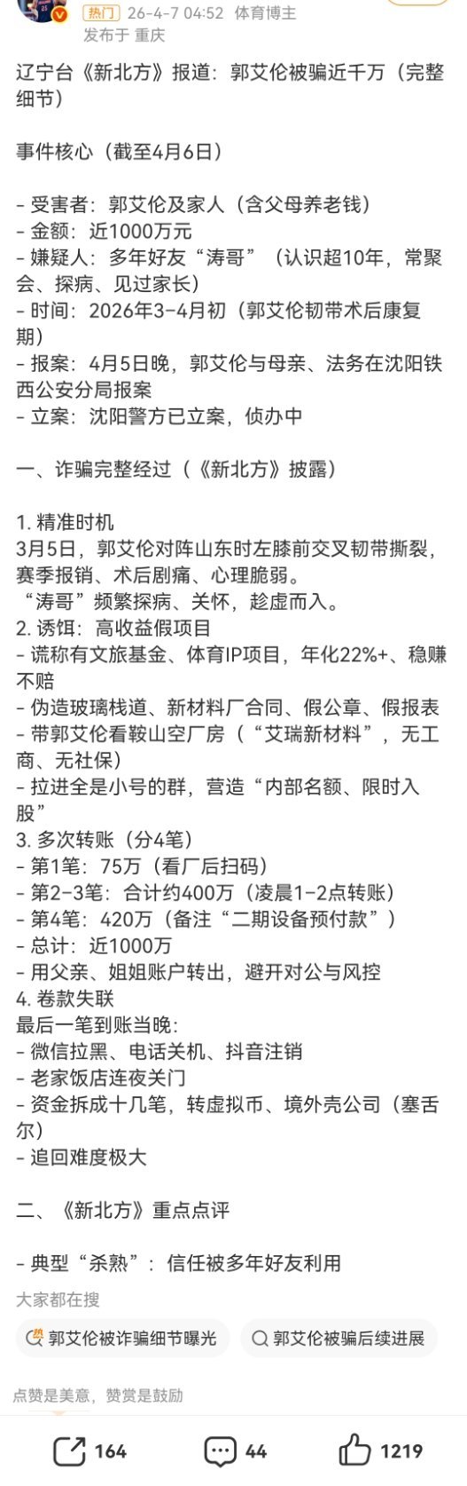 刚刚看到,郭艾伦又上了热搜,这次更倒霉:被骗了上千万。据悉,骗子系郭艾伦长期