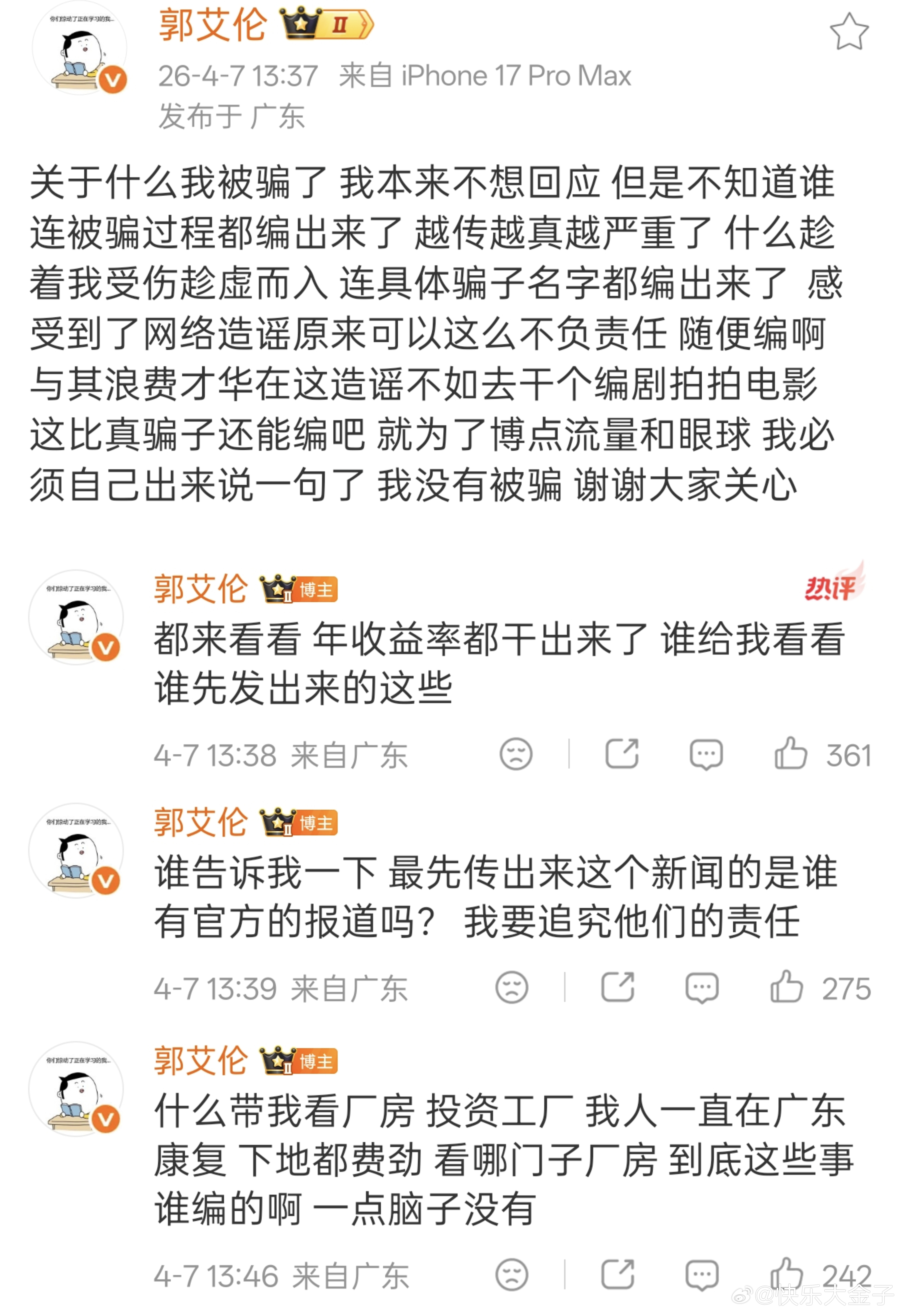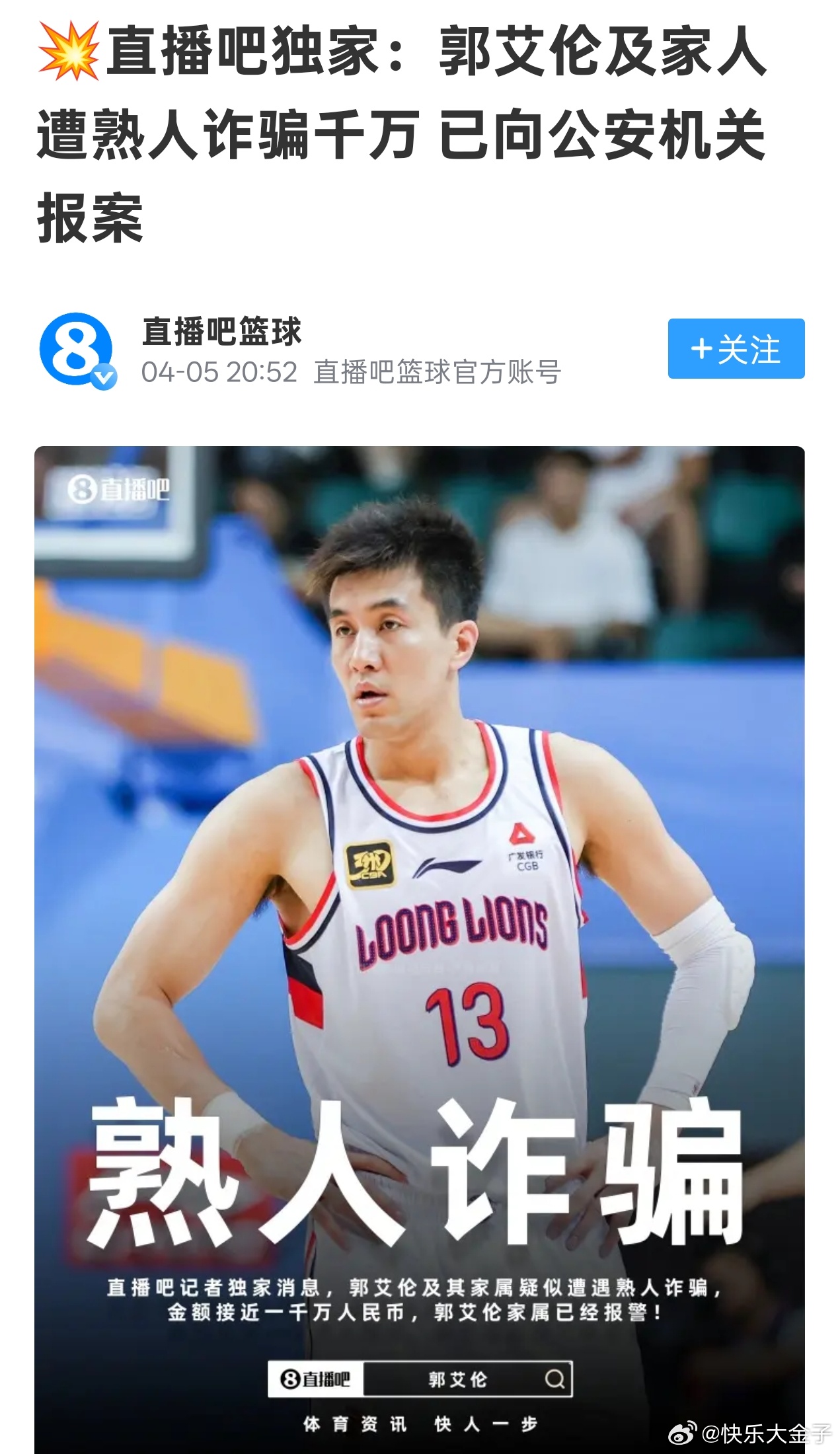 郭艾伦否认被骗 郭艾伦本人回应“被骗千万”为谣言,并表示将追究最先传出来的媒体。