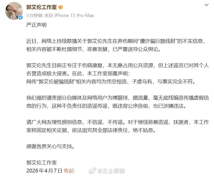 快不要传了,假的!郭艾伦和其工作室相继发表声明,否认被骗。郭艾伦表示,连名字