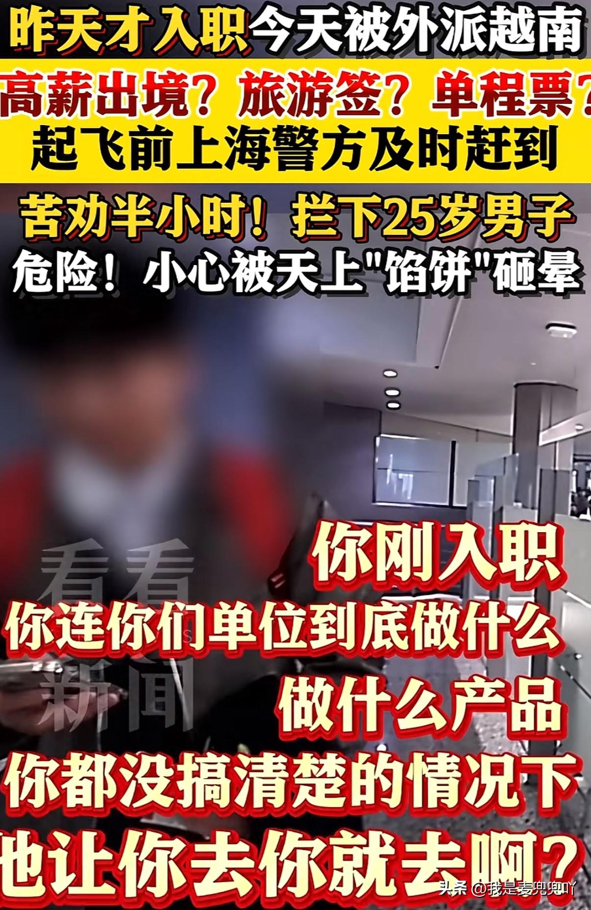 25岁小伙应聘入职第二天就被公司外派越南接替主管工作,福利好薪水高。起飞前半个小时被机场警方拦下 小伙子刘某表示工作是在网上找的昨天刚入职,公司具体做什么的他也不是很清楚,只知道是一家数字产业链公司,福利待遇很好,入职第二天公司给他买了前往越南胡志明市的单程机票前往接管项目,但公司办理的却是旅游签证而非工作签证 在警方苦劝下刘某最终放弃前往越南 高薪招聘,旅游签代替工作签,单程机票这些都是危险信号。还好刘某将要去越南工作的事告诉了朋友,朋友劝不下来报警警方在听了刘某朋友的讲述后迅速行动在临起飞前半个小时将其劝下
