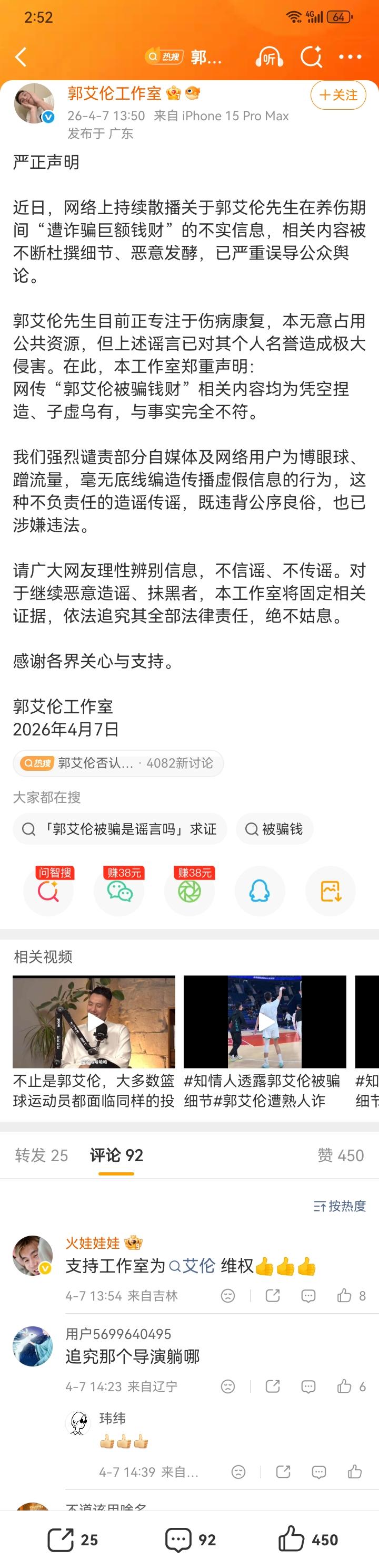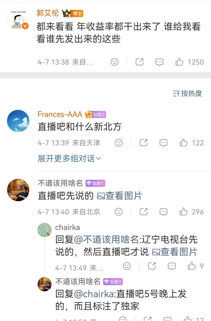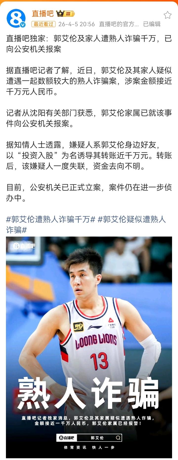关于郭艾伦家人被诈骗近千万,最早是直播吧爆出来的。而且直播吧明确表示独家。4月5死清明节当天晚上8点56分发出来的。然后郭艾伦本人亲自下场辟谣说没有被骗,他的工作室也发文说没有被骗。工作室发文比球员本人发文晚了十三分钟,7号下午1点50。这就有意思了,艾伦和直播吧,到底谁没有说实话?到底有没有被诈骗有没有到沈阳报警? 有意思了。