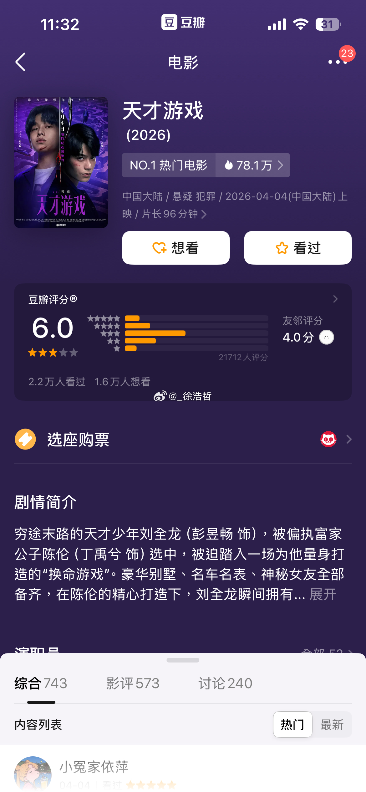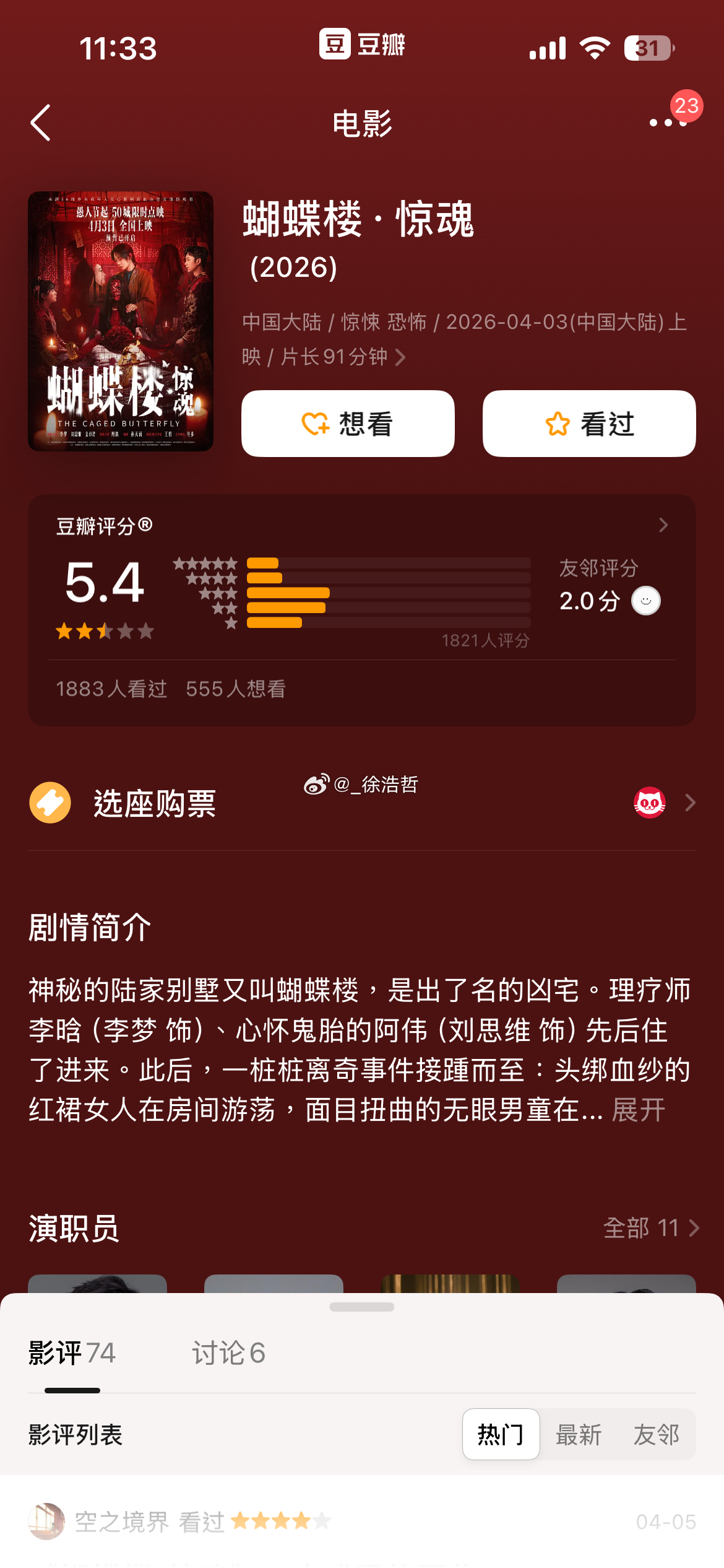 清明档又有四部电影豆瓣已经开分《超级马力欧银河大电影》7.2《阳光女子合唱团》7.4《天才游戏》6.0《蝴蝶楼·惊魂》5.4还差《我的妈耶》未开分了