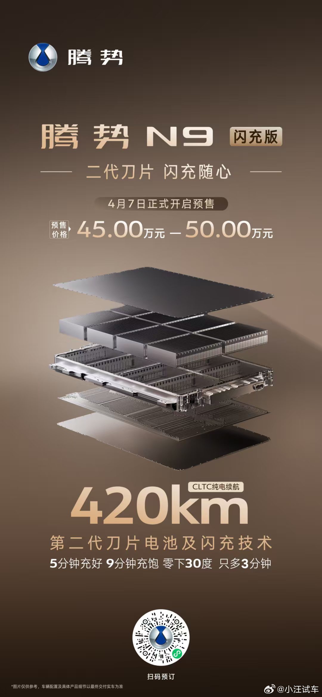 标配第二代刀片电池,纯电续航420km标配天神之眼5.0、新一代AI智能座舱还有易三方、云辇A等核心科技腾势N9闪充版预售价45万-50万元共享18个月免费闪充权益