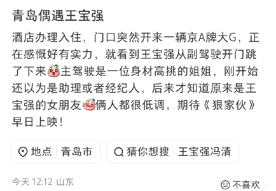 没想到看着瘦小的王宝强,开的车和谈的女友都这么大气。近日王宝强和女友冯清在青岛某酒店被偶遇,王宝强开着他京牌的大G闪亮登场,穿着算是比较低调,一件卫衣戴着帽子,旁边的女友冯清比他高半个头。