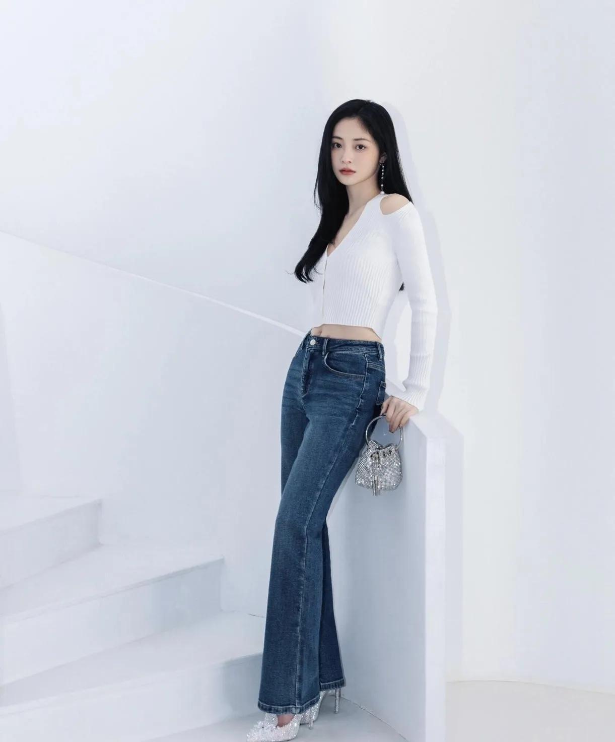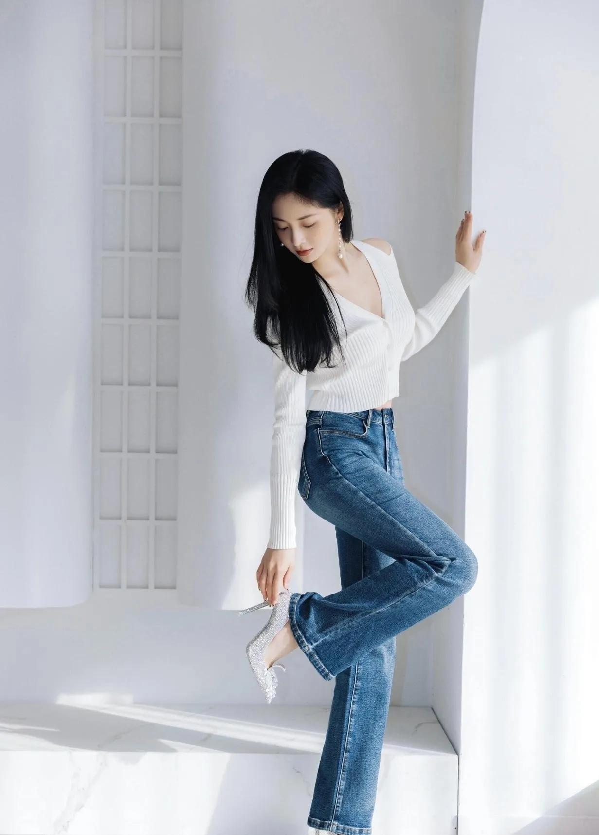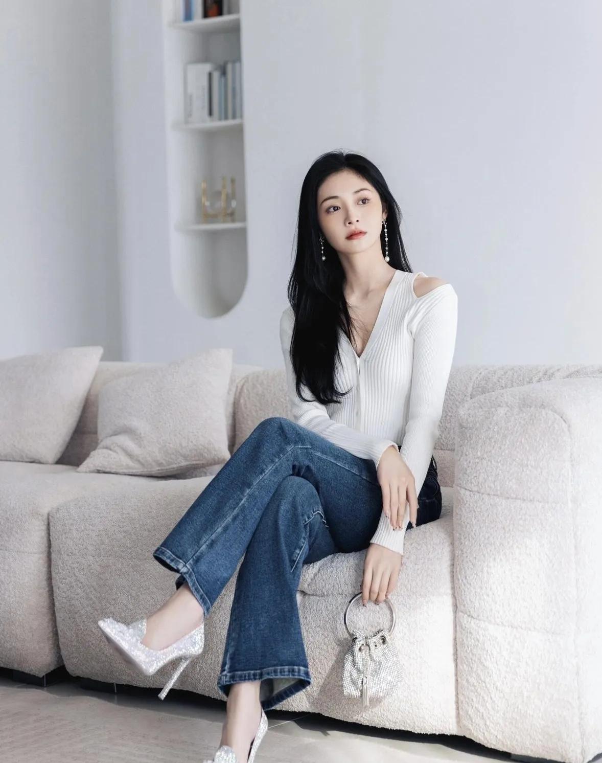 周洁琼这套穿搭直接封神!白针织+牛仔裤+钻跟鞋,把通勤和精致焊死了!