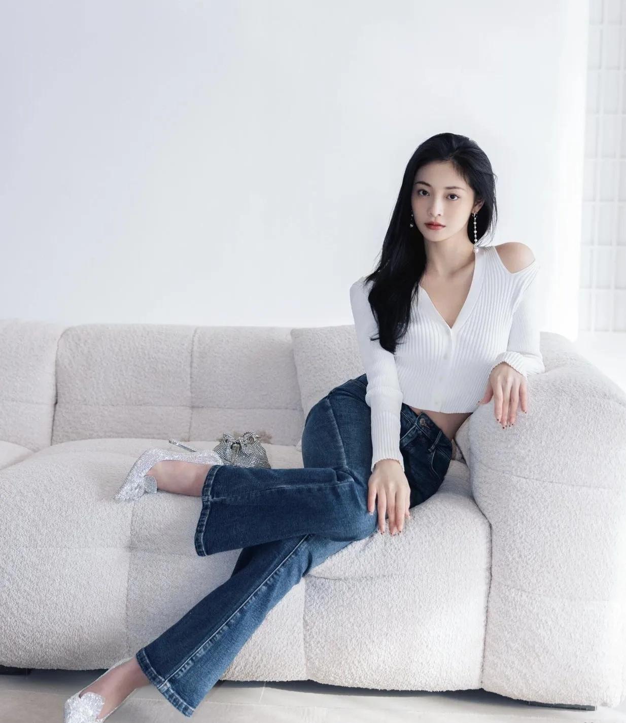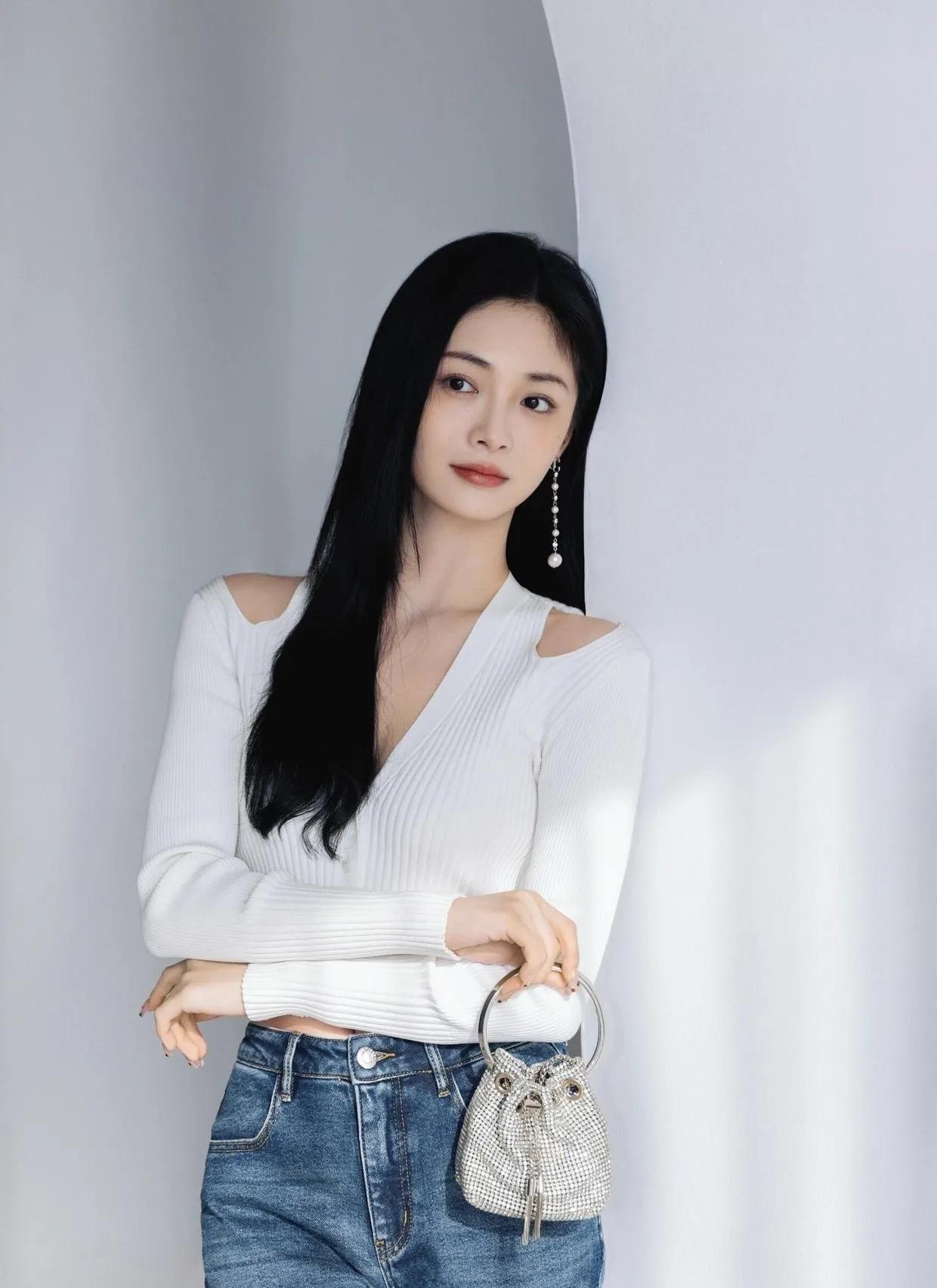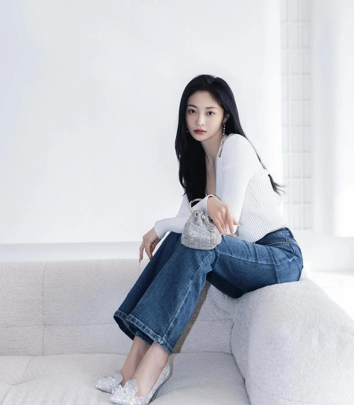 周洁琼这套穿搭直接封神!白针织+牛仔裤+钻跟鞋,把通勤和精致焊死了!