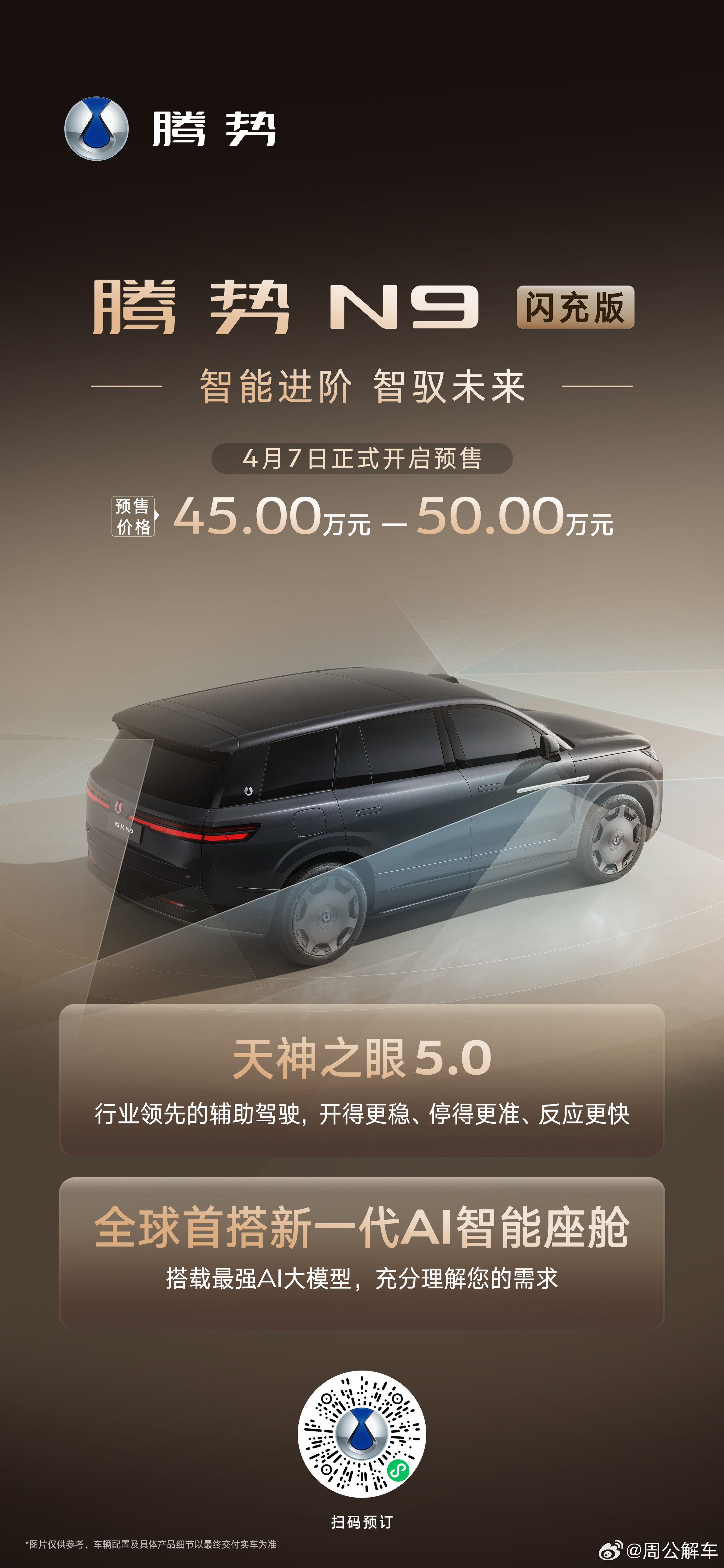 标配第二代刀片电池,纯电续航420km标配天神之眼5.0、新一代AI智能座舱还有易三方、云辇A等核心科技腾势N9闪充版预售价45万-50万元共享18个月免费闪充权益