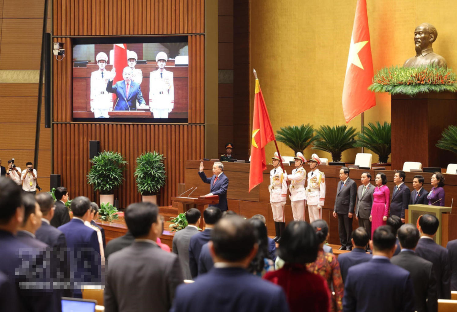 根据越通社的报道,在4月7日上午的国会选举中,越共中央总书记苏林当选为越南国家主席,任期从2026年~2031年。电子表决系统的结果显示,全部495名参会代表投下了赞成票。随后,苏林手扶宪法,宣誓就任国家主席。